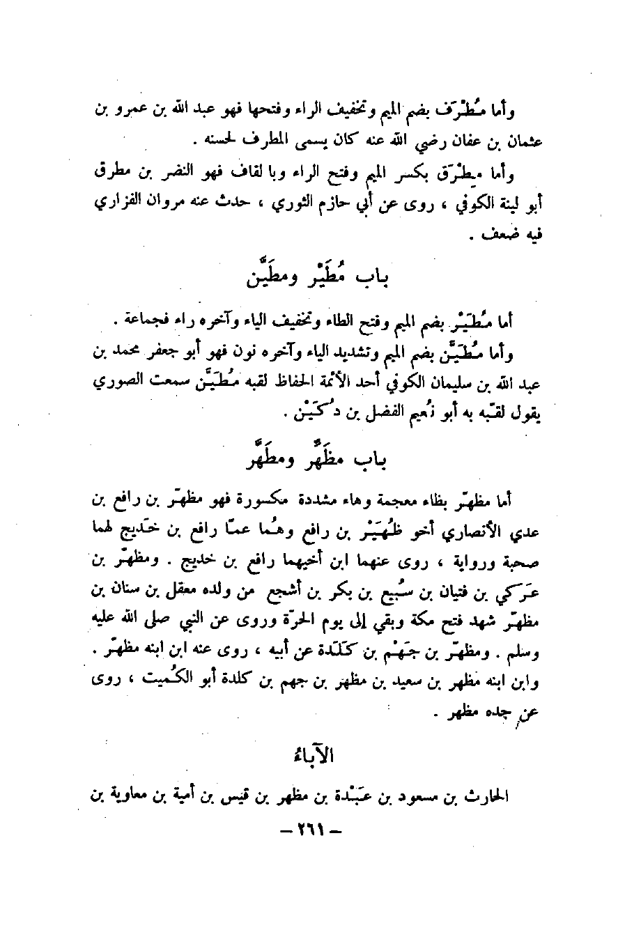 وأما بصر مثل ما قبله إلا أن أوله باء معجمة بواحدة، فهو أبو جعفر النفيلي المحدث واسمه عبد الله بن محمد بن علي ابن نفيل بن زراع بن عبد الله بن قيس بن عصم، بن كوز بن هلال بن عصم بن بصر بن زمان بن خزيمة بن نهد بن زيد بن ليث بن سود بن أسلم بن الحاف، بن قضاعة ذكره أبو علي التنوخي في نسب تنوخ، وقال: وبعض النساب يقول: نصر بالنون وبالصاد الساكنة.