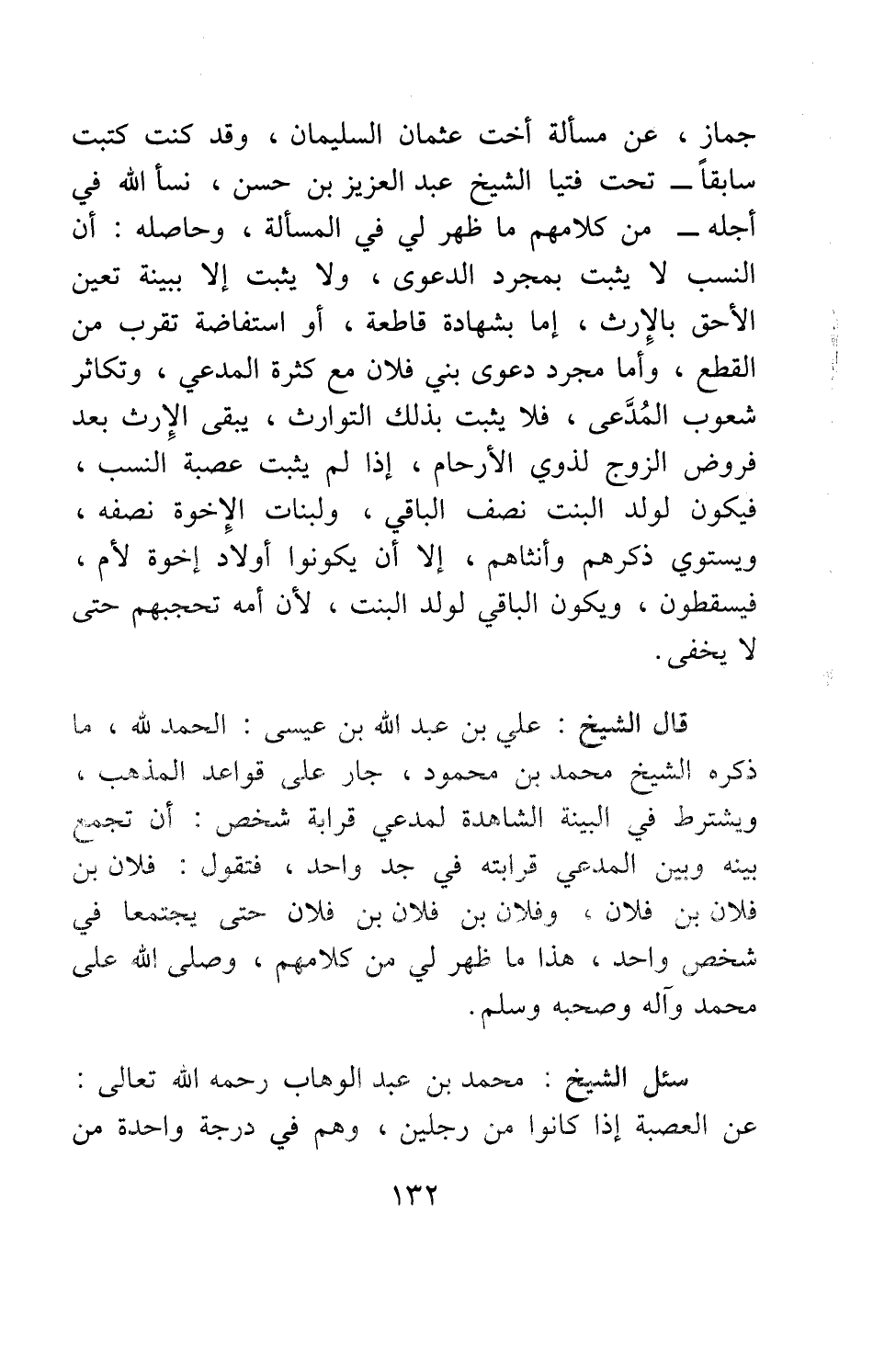 سئل الشيخ محمد بن عبد الوهاب، رحمه الله تعالى: عن العصبة إذا كانوا من رجلين، وهم في درجة واحدة من