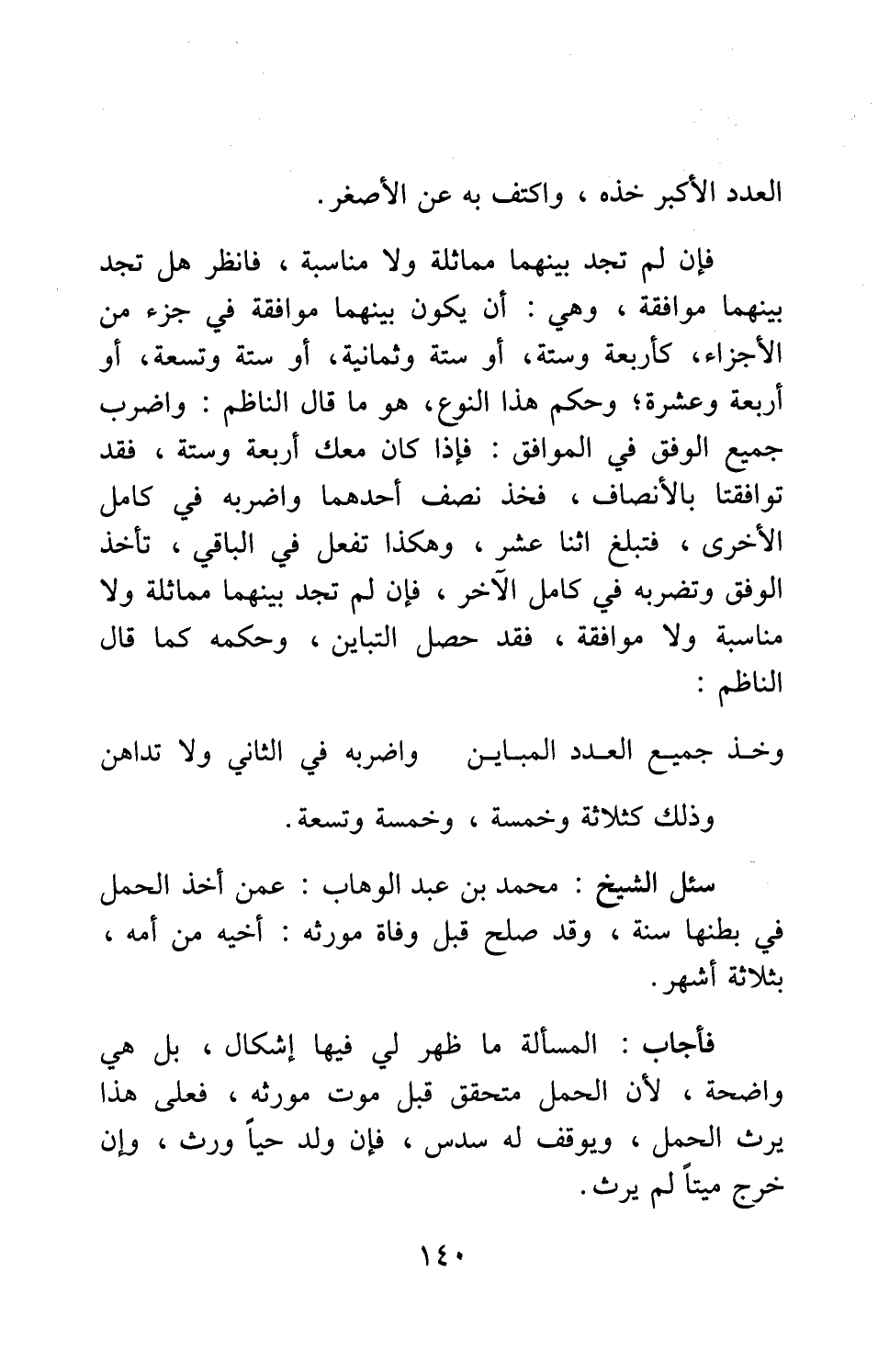العدد الأكبر خذه، واكتف به عن الأصغر. فإن لم تجد بينهما مماثلة ولا مناسبة، فانظر هل تجد بينهما موافقة، وهي: أن يكون بينهما موافقة في جزء من الأجزاء، كأربعة وستة، أو ستة وثمانية، أو ستة وتسعة، أو أربعة وعشرة; وحكم هذا النوع، هو ما قال الناظم: