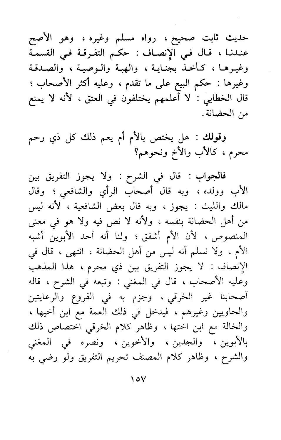 وقولك: هل يختص بالأم أم يعم ذلك كل ذي رحم محرم، كالأب والأخ ونحوهم؟ فالجواب: قال في الشرح: ولا يجوز التفريق بين الأب وولده، وبه قال أصحاب الرأي والشافعي. وقال مالك والليث: يجوز، وبه قال بعض الشافعية، لأنه ليس من أهل الحضانة بنفسه، ولأنه لا نص فيه ولا هو في معنى المنصوص، لأن الأم أشفق; ولنا أنه أحد الأبوين أَشْبَهَ الأم، ولا نسلم أنه ليس من أهل الحضانة. انتهى. قال في الإنصاف: لا يجوز التفريق بين ذي محرم، هذا المذهب وعليه الأصحاب، قال في المغني، وتبعه في الشرح: قاله أصحابنا غير الخرقي، وجزم به في الفروع والرعايتين والحاويين وغيرهم، فيدخل في ذلك العمة مع ابن أخيها، والخالة مع ابن أختها. وظاهر كلام الخرقي اختصاص ذلك بالأبوين، والجدين، والأخوين، ونصره في المغني والشرح. وظاهر كلام المصنف تحريم التفريق ولو رضي به،