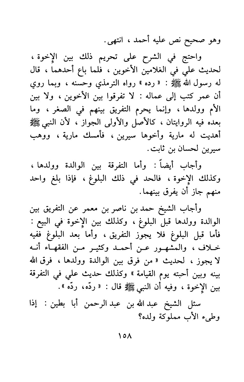 وأجاب الشيخ حمد بن ناصر بن معمر عن التفريق بين الوالدة وولدها قبل البلوغ، وكذلك بين الإخوة في البيع: فأما قبل البلوغ فلا يجوز التفريق، وأما بعد البلوغ ففيه خلاف؛ والمشهور عن أحمد وكثير من الفقهاء أنه لا يجوز، لحديث: " من فرق بين الوالدة وولدها، فرق الله بينه وبين أحبته يوم القيامة " 2، وكذلك حديث علي في التفرقة بين الإخوة، وفيه أن النبي صلى الله عليه وسلم قال: " رُدَّهُ، رُدَّهُ ".