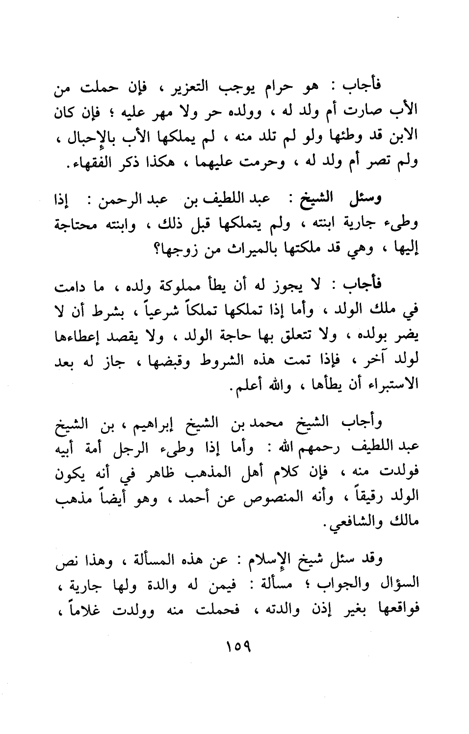 وأجاب الشيخ محمد بن الشيخ إبراهيم بن الشيخ عبد اللطيف، رحمهم الله: وأما إذا وطئ الرجل أمة أبيه فولدت منه، فإن كلام أهل المذهب ظاهر في أنه يكون الولد رقيقاً، وأنه المنصوص عن أحمد، وهو أيضاً مذهب مالك والشافعي.