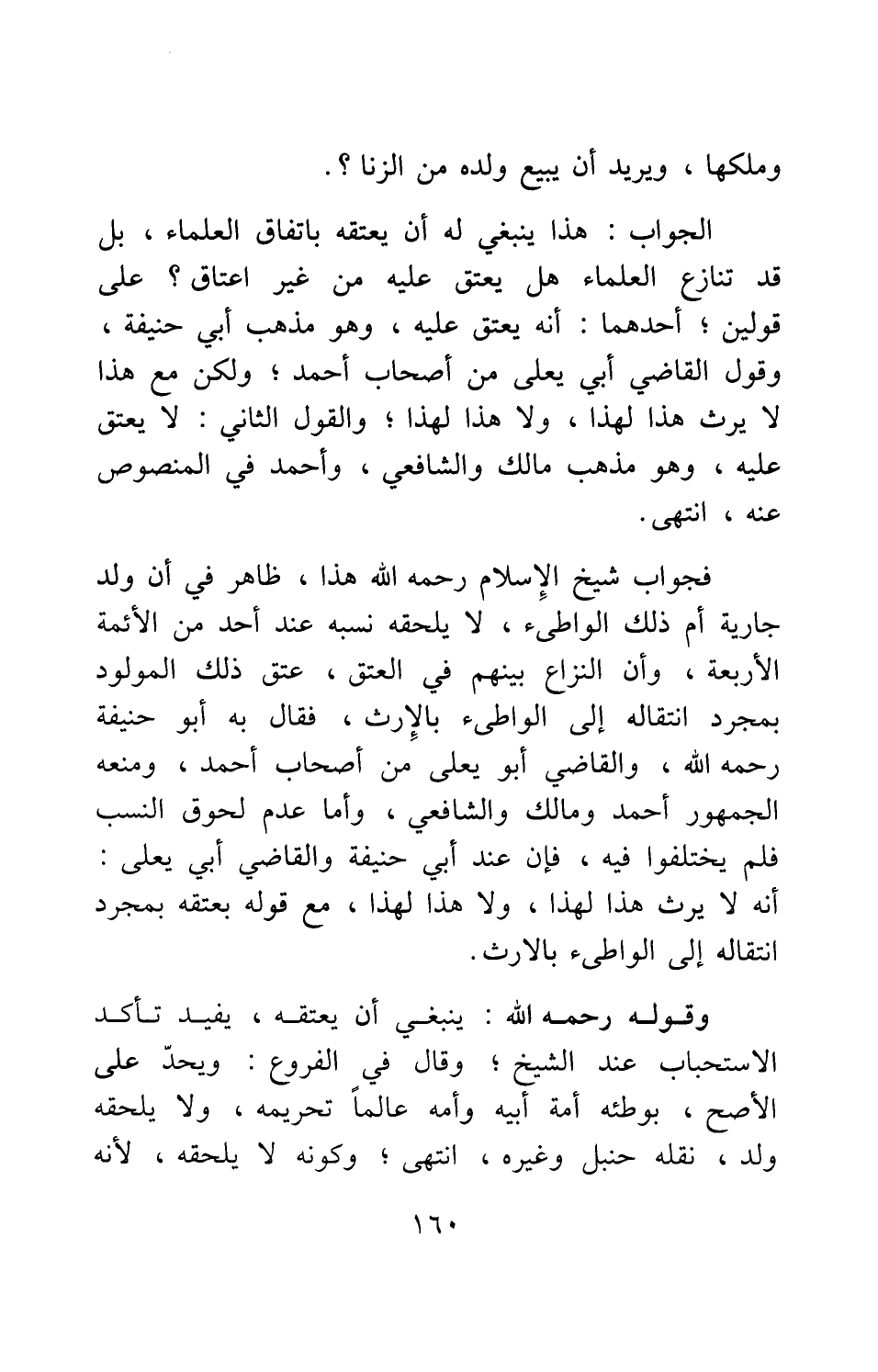فجواب شيخ الإسلام، رحمه الله، هذا، ظاهر في أن ولد جارية أم ذلك الواطئ، لا يلحقه نسبه عند أحد من الأئمة الأربعة، وأن النّزاع بينهم في العتق، عتق ذلك المولود بمجرد انتقاله إلى الواطئ بالإرث: فقال به أبو حنيفة، رحمه الله، والقاضي أبو يعلى من أصحاب أحمد، ومنعه الجمهور أحمد ومالك والشافعي. وأما عدم لحوق النسب فلم يختلفوا فيه، فإن عند أبي حنيفة والقاضي أبي يعلى: أنه لا يرث هذا لهذا، ولا هذا لهذا، مع قوله بعتقه بمجرد انتقاله إلى الواطئ بالإرث.