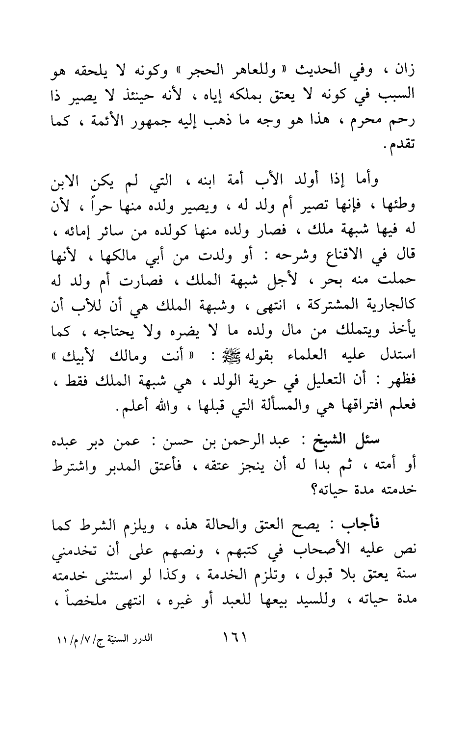 وأما إذا أولد الأب أمة ابنه، التي لم يكن الابن وطئها، فإنها تصير أم ولد له، ويصير ولده منها حراً، لأن له فيها شبهة ملك، فصار ولده منها كولده من سائر إمائه؛ قال في الإقناع وشرحه: أو ولدت من أبي مالكها، لأنها حملت منه بحر، لأجل شبهة الملك، فصارت أم ولد له كالجارية المشتركة. انتهى. وشبهة الملك هي أن للأب أن يأخذ ويتملك من مال ولده ما لا يضره ولا يحتاجه، كما استدل عليه العلماء بقوله صلى الله عليه وسلم: " أنت ومالك لأبيك " 2، فظهر أن التعليل في حرية الولد، هي شبهة الملك فقط، فعلم افتراقها هي والمسألة التي قبلها، والله أعلم.