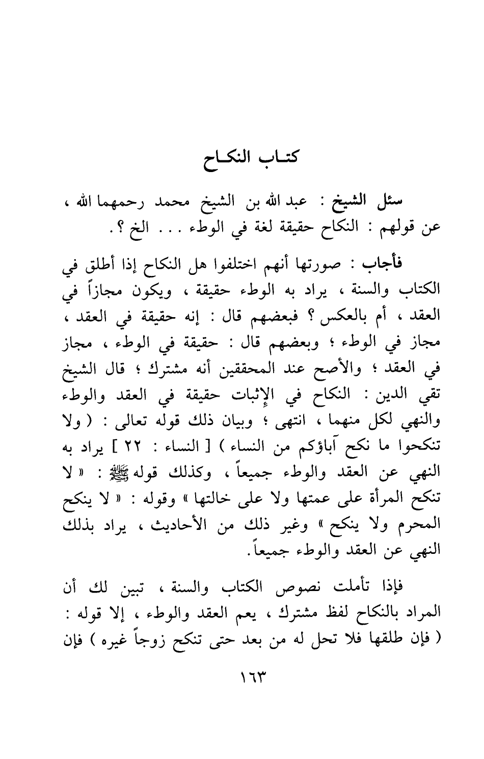 سئل الشيخ: عبد الله بن الشيخ محمد، رحمهما الله، عن قولهم: النكاح حقيقة لغة في الوطء ... إلخ؟