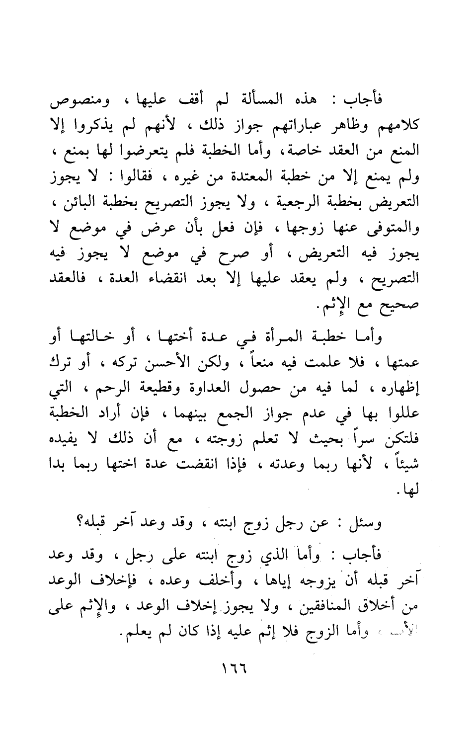 فأجاب: وأما الذي زوج ابنته على رجل، وقد وعد آخر قبله أن يزوجه إياها، وأخلف وعده، فإخلاف الوعد من أخلاق المنافقين، ولا يجوز إخلاف الوعد. والإثم على الأب، وأما الزوج فلا إثم عليه إذا كان لم يعلم.
