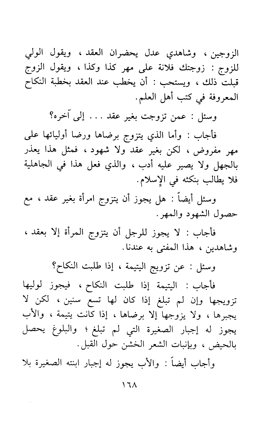 فأجاب: اليتيمة إذا طلبت النكاح، فيجوز لوليها تزويجها وإن لم تبلغ، إذا كان لها تسع سنين؛ لكن لا يجبرها، ولا يزوجها إلا برضاها، إذا كانت يتيمة. والأب يجوز له إجبار الصغيرة التي لم تبلغ. والبلوغ يحصل بالحيض، وبإنبات الشعر الخشن حول القبل.