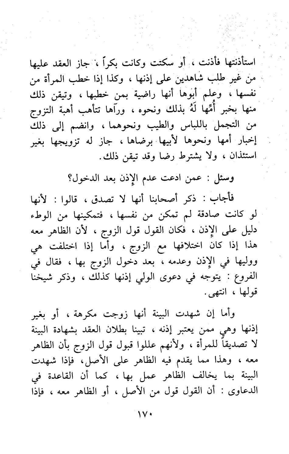 فأجاب: ذكر أصحابنا أنها لا تصدق، قالوا: لأنها لو كانت صادقة لم تمكن من نفسها، فتمكينها من الوطء دليل على الإذن؛ فكان القول قول الزوج، لأن الظاهر معه؛ هذا إذا كان اختلافها مع الزوج، وأما إذا اختلفت هي ووليها في الإذن وعدمه، بعد دخول الزوج بها، فقال في الفروع: يتوجه في دعوى الولي إذنها كذلك، وذكر شيخنا قولها. انتهى.