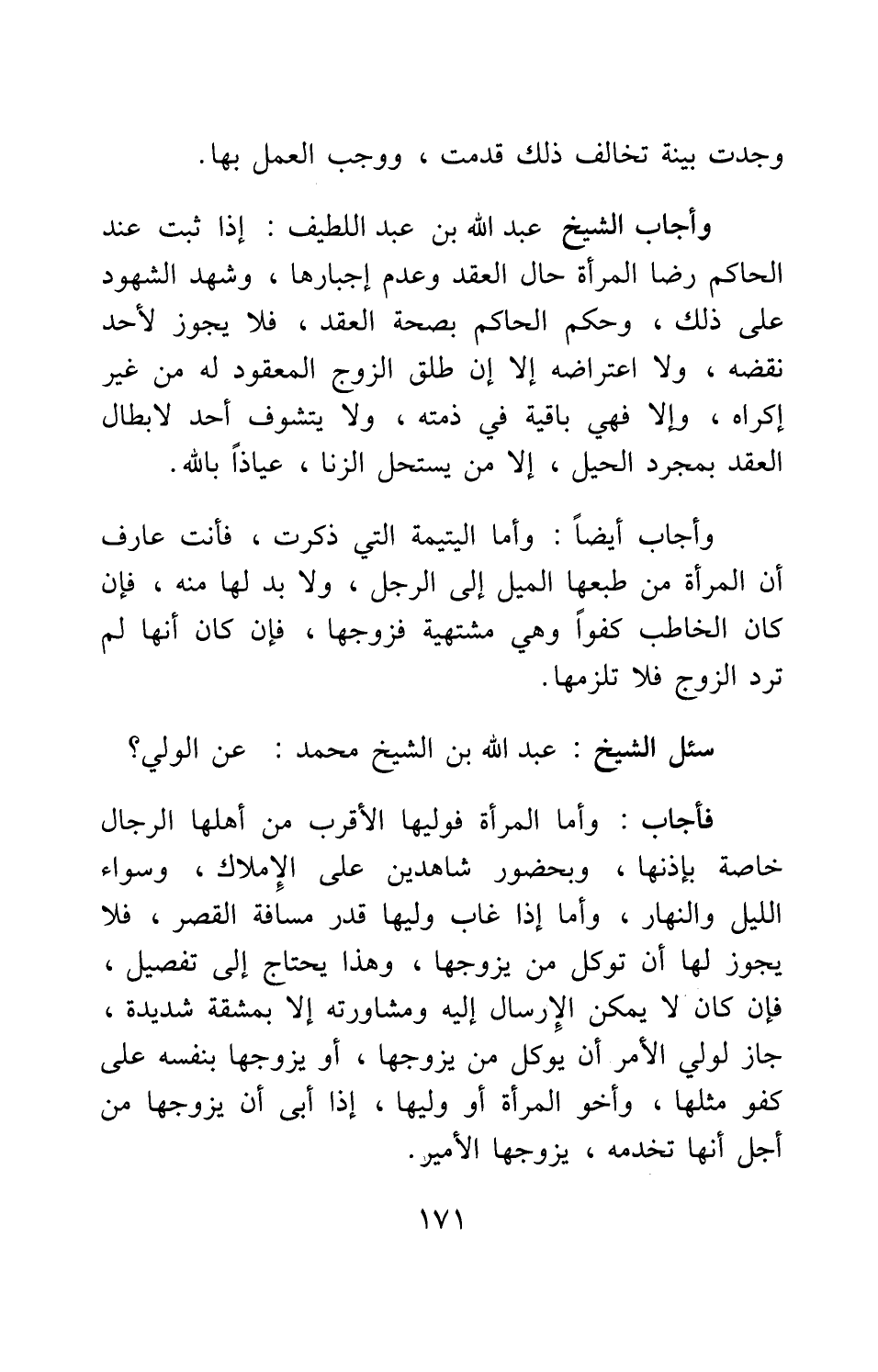 وأجاب أيضاً: وأما اليتيمة التي ذكرت، فأنت عارف أن المرأة من طبعها الميل إلى الرجل، ولا بد لها منه، فإن كان الخاطب كفواً وهي مشتهية فزوِّجْها، فإن كان أنها لم ترد الزوج فلا تلزمها.