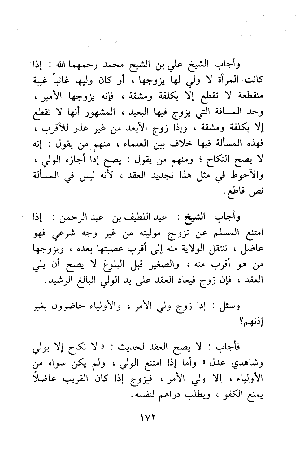 وأجاب الشيخ علي بن الشيخ محمد، رحمهما الله: إذا كانت المرأة لا ولي لها يزوجها، أو كان وليها غائباً غيبة منقطعة لا تقطع إلا بكلفة ومشقة، فإنه يزوجها الأمير. وحد المسافة التي يزوج فيها البعيد، المشهور أنها لا تقطع إلا بكلفة ومشقة. وإذا زوج الأبعد من غير عذر للأقرب، فهذه المسألة فيها خلاف بين العلماء: منهم من يقول: إنه لا يصح النكاح; ومنهم من يقول: يصح إذا أجازه الولي؛ والأحوط في مثل هذا تجديد العقد، لأنه ليس في المسألة نص قاطع.