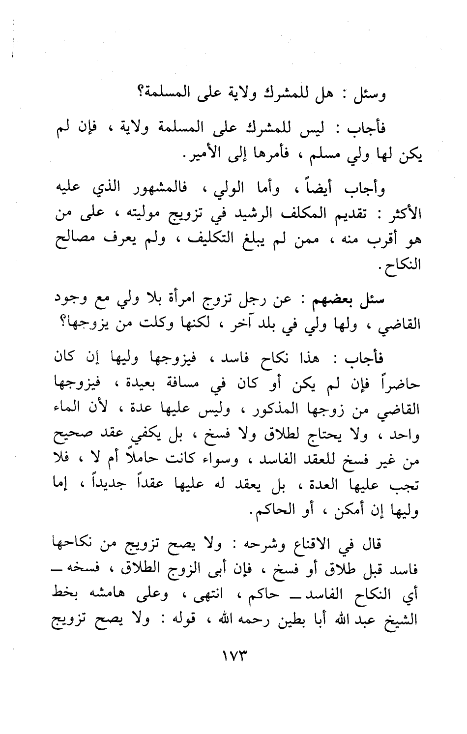 فأجاب: هذا نكاح فاسد، فيزوجها وليها إن كان حاضراً، فإن لم يكن أو كان في مسافة بعيدة، فيزوجها القاضي من زوجها المذكور. وليس عليها عدة، لأن الماء واحد، ولا يحتاج لطلاق ولا فسخ، بل يكفي عقد صحيح من غير فسخ للعقد الفاسد. وسواء كانت حاملاً أم لا، فلا تجب عليها العدة، بل يعقد له عليها عقداً جديداً، إما وليها إن أمكن، أو الحاكم.