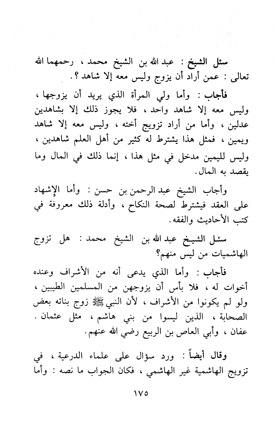 وقال أيضاً: ورد سؤال على علماء الدرعية، في تزويج الهاشمية غير الهاشمي، فكان الجواب ما نصه: وأما