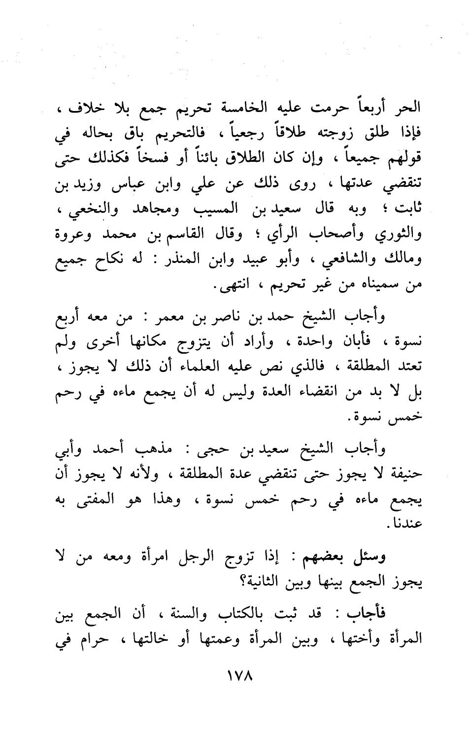 وأجاب الشيخ حمد بن ناصر بن معمر: من معه أربع نسوة، فأبان واحدة، وأراد أن يتزوج مكانها أخرى ولم تعتد المطلقة، فالذي نص عليه العلماء أن ذلك لا يجوز؛ بل لا بد من انقضاء العدة، وليس له أن يجمع ماءه في رحم خمس نسوة.