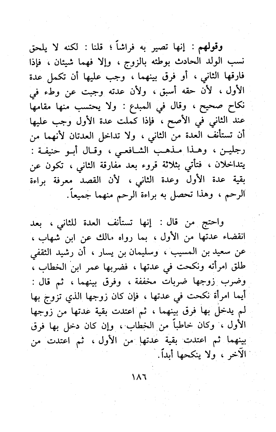وقولهم: إنها تصير به فراشاً، قلنا: لكنه لا يلحق نسب الولد الحادث بوطئه بالزوج، وإلا فهما شيئان، فإذا فارقها الثاني، أو فرق بينهما، وجب عليها أن تكمل عدة الأول، لأن حقه أسبق، ولأن عدته وجبت عن وطء في نكاح صحيح. وقال في المبدع: ولا يحتسب منها مقامها عند الثاني في الأصح، فإذا كملت عدة الأول وجب عليها أن تستأنف العدة من الثاني، ولا تداخل العدتان لأنهما من رجلين؛ وهذا مذهب الشافعي. وقال أبو حنيفة: يتداخلان، فتأتي بثلاثة قروء بعد مفارقة الثاني، تكون عن بقية عدة الأول وعدة الثاني، لأن القصد معرفة براءة الرحم، وهذا تحصل به براءة الرحم منهما جميعاً.