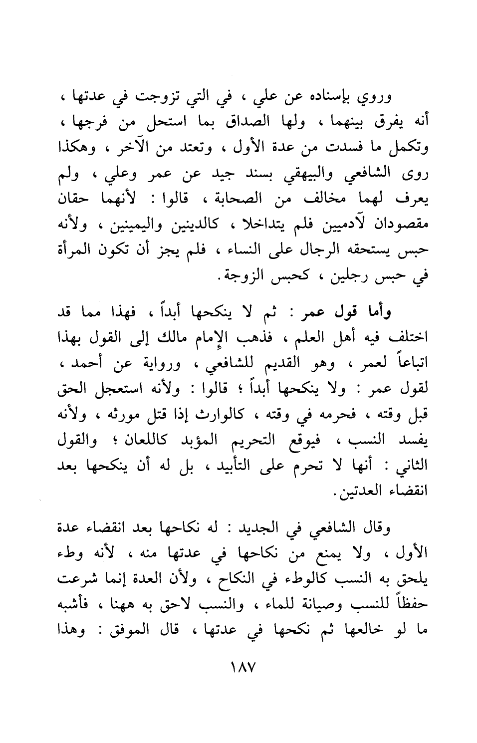 وروى بإسناده عن علي، في التي تزوجت في عدتها "أنه يفرق بينهما، ولها الصداق بما استحل من فرجها، وتكمل ما فسدت من عدة الأول، وتعتد من الآخر"، وهكذا روى الشافعي والبيهقي بسند جيد عن عمر وعلي، ولم يعرف لهما مخالف من الصحابة، قالوا: لأنهما حقان مقصودان لآدميين فلم يتداخلا، كالدينين واليمينين، ولأنه حبس يستحقه الرجال على النساء، فلم يجز أن تكون المرأة في حبس رجلين، كحبس الزوجة.