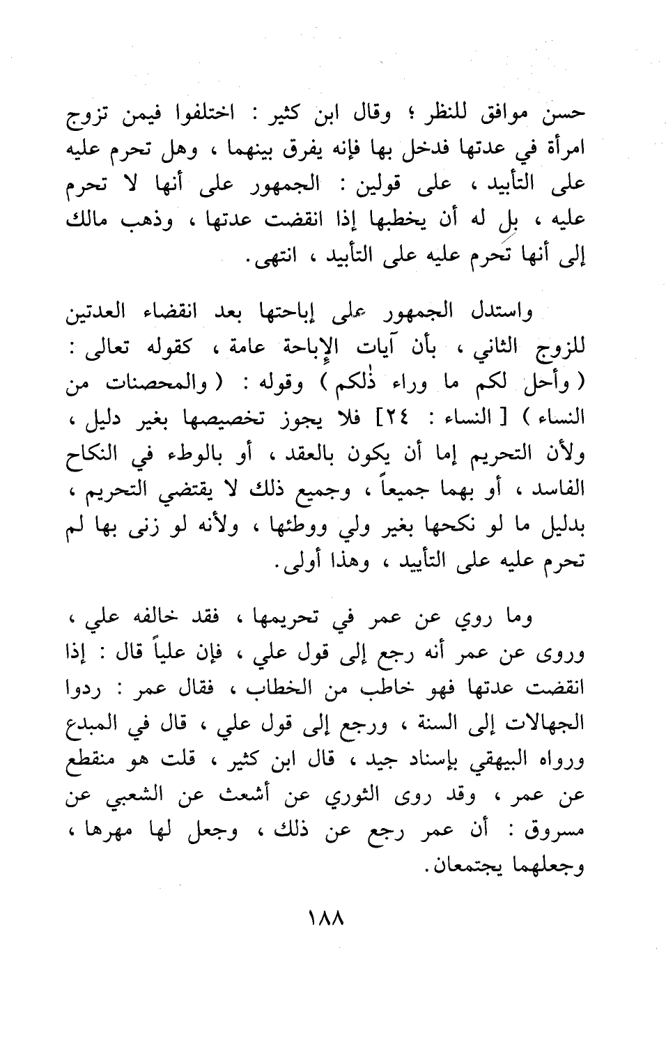 حسن موافق للنظر. وقال ابن كثير: اختلفوا فيمن تزوج امرأة في عدتها فدخل بها، فإنه يفرق بينهما. وهل تحرم عليه على التأبيد؟ على قولين: الجمهور على أنها لا تحرم عليه، بل له أن يخطبها إذا انقضت عدتها. وذهب مالك إلى أنها تحرم عليه على التأبيد. انتهى.
