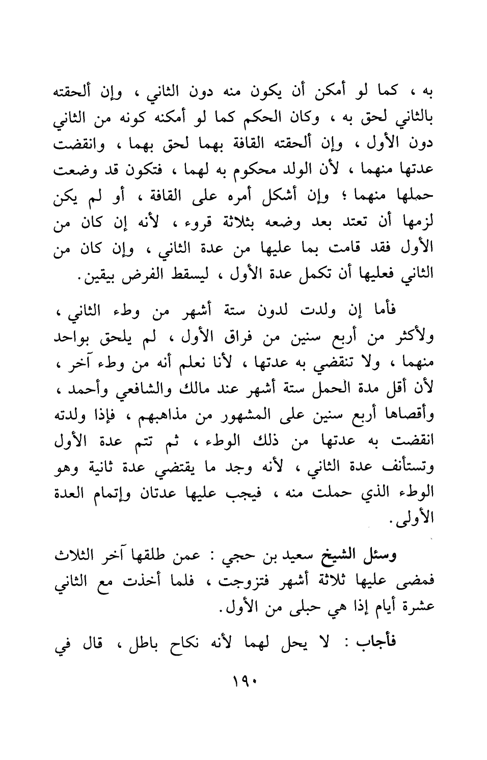 به، كما لو أمكن أن يكون منه دون الثاني، وإن ألحقته بالثاني لحق به، وكان الحكم كما لو أمكنه كونه من الثاني دون الأول. وإن ألحقته القافة بهما لحق بهما، وانقضت عدتها منهما، لأن الولد محكوم به لهما، فتكون قد وضعت حملها منهما. وإن أشكل أمره على القافة، أو لم يكن لزمها أن تعتد بعد وضعه بثلاثة قروء، لأنه إن كان من الأول فقد قامت بما عليها من عدة الثاني، وإن كان من الثاني فعليها أن تكمل عدة الأول، ليسقط الفرض بيقين.