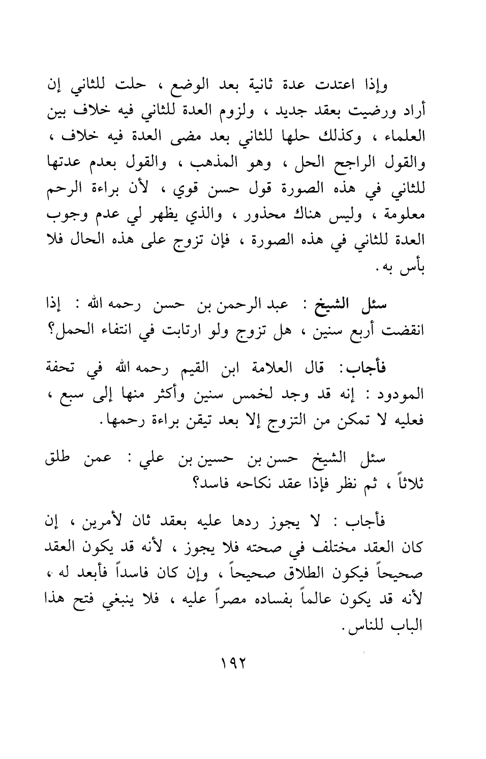 فأجاب: لا يجوز ردها عليه بعقد ثان لأمرين: إن كان العقد مختلف في صحته فلا يجوز، لأنه قد يكون العقد صحيحاً فيكون الطلاق صحيحاً. وإن كان فاسداً فأبعد له، لأنه قد يكون عالماً بفساده مصراً عليه، فلا ينبغي فتح هذا الباب للناس.