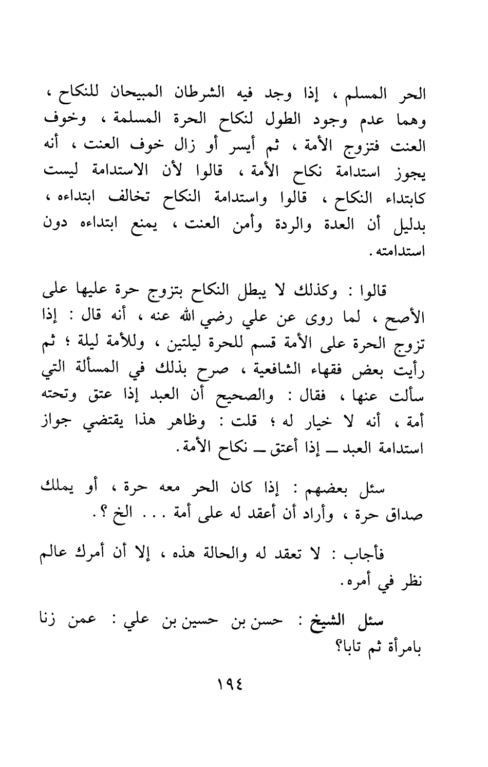 الحر المسلم، إذا وجد فيه الشرطان المبيحان للنكاح، وهما: عدم وجود الطول لنكاح الحرة المسلمة، وخوف العنت، فتزوج الأمة، ثم أيسر أو زال خوف العنت، أنه يجوز استدامة نكاح الأمة، قالوا: لأن الاستدامة ليست كابتداء النكاح، قالوا: واستدامة النكاح تخالف ابتداءه، بدليل أن العدة والردة وأمن العنت، يمنع ابتداءه دون استدامته.