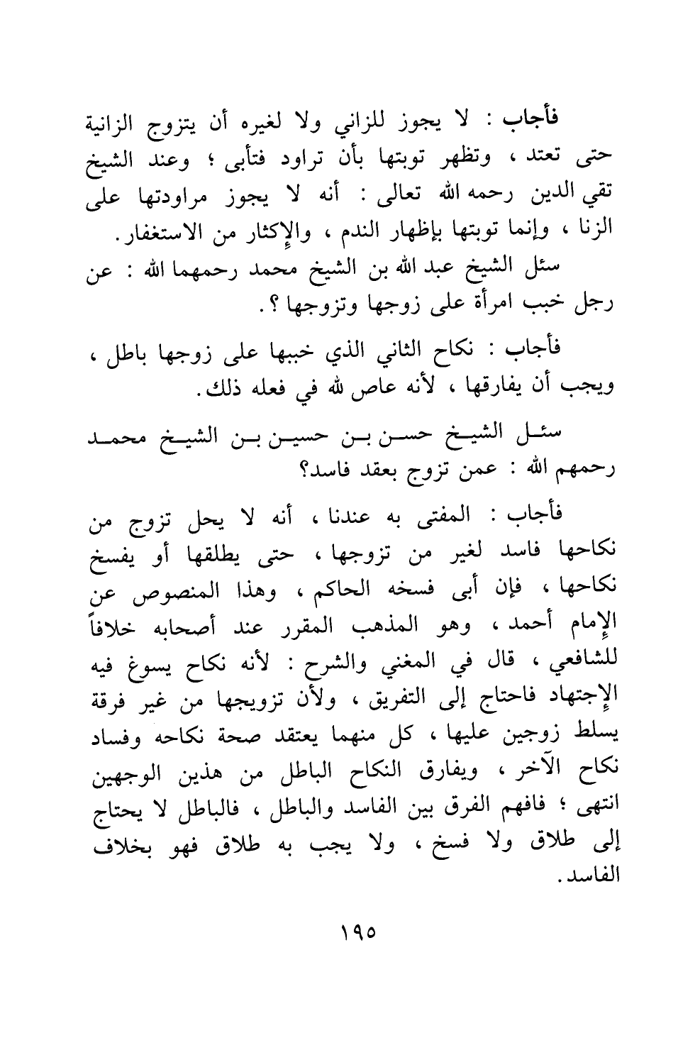 فأجاب: المفتى به عندنا، أنه لا يحل تزوج من نكاحها فاسد لغير من تزوجها، حتى يطلقها أو يفسخ نكاحها، فإن أبى، فسخه الحاكم؛ وهذا المنصوص عن الإمام أحمد، وهو المذهب المقرر عند أصحابه خلافاً للشافعي. قال في المغني والشرح: لأنه نكاح يسوغ فيه الاجتهاد، فاحتاج إلى التفريق، ولأن تزويجها من غير فرقة يسلط زوجين عليها، كل منهما يعتقد صحة نكاحه وفساد نكاح الآخر، ويفارق النكاح الباطل من هذين الوجهين. انتهى.