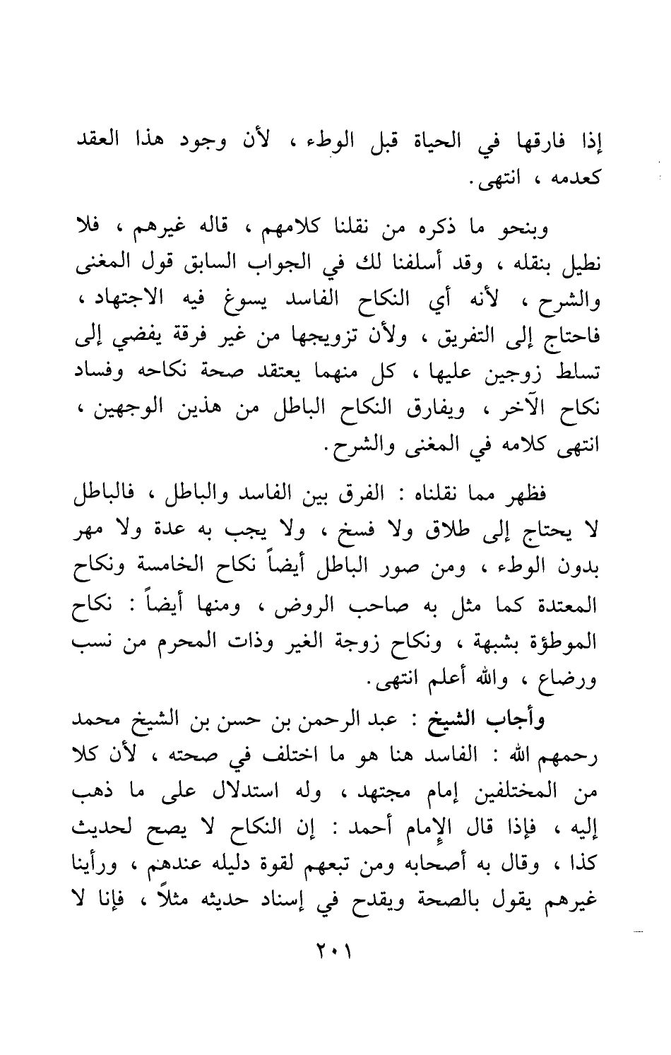 وأجاب الشيخ عبد الرحمن بن حسن بن الشيخ محمد، رحمهم الله: الفاسد هنا هو ما اختلف في صحته، لأن كلاً من المختلفين إمام مجتهد، وله استدلال على ما ذهب إليه. فإذا قال الإمام أحمد: إن النكاح لا يصح لحديث كذا، وقال به أصحابه ومن تبعهم لقوة دليله عندهم، ورأينا غيرهم يقول بالصحة ويقدح في إسناد حديثه مثلاً، فإنا لا