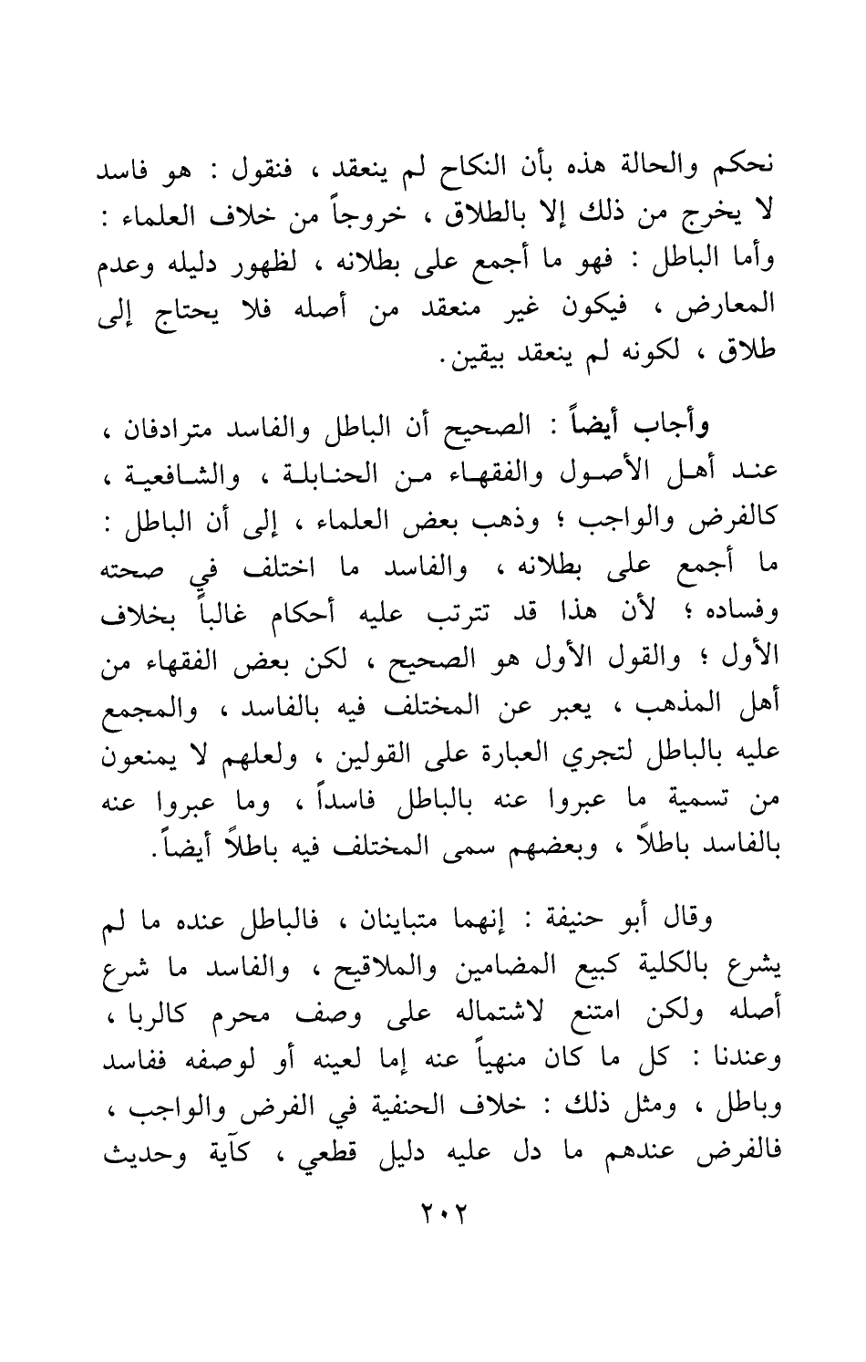 وأجاب أيضاً: الصحيح أن الباطل والفاسد مترادفان عند أهل الأصول والفقهاء من الحنابلة، والشافعية، كالفرض والواجب; وذهب بعض العلماء إلى أن الباطل: ما أجمع على بطلانه، والفاسد: ما اختلف في صحته وفساده، لأن هذا قد تترتب عليه أحكام غالباً بخلاف الأول; والقول الأول هو الصحيح، لكن بعض الفقهاء من أهل المذهب، يعبر عن المختلف فيه بالفاسد، والمجمع عليه بالباطل لتجري العبارة على القولين، ولعلهم لا يمنعون من تسمية ما عبروا عنه بالباطل فاسداً، وما عبروا عنه بالفاسد باطلاً، وبعضهم سمى المختلف فيه باطلاً أيضاً.