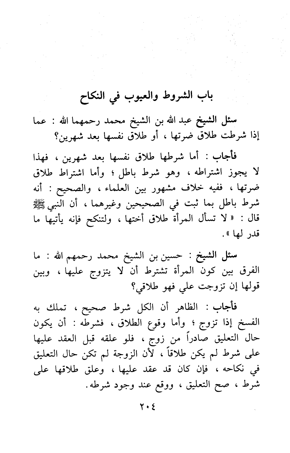 فأجاب: الظاهر أن الكل شرط صحيح، تملك به الفسخ إذا تزوج. وأما وقوع الطلاق، فشرطه: أن يكون حال التعليق صادراً من زوج؛ فلو علقه قبل العقد عليها على شرط لم يكن طلاقاً، لأن الزوجة لم تكن حال التعليق في نكاحه. فإن كان قد عقد عليها، وعلق طلاقها على شرط، صح التعليق، ووقع عند وجود شرطه.