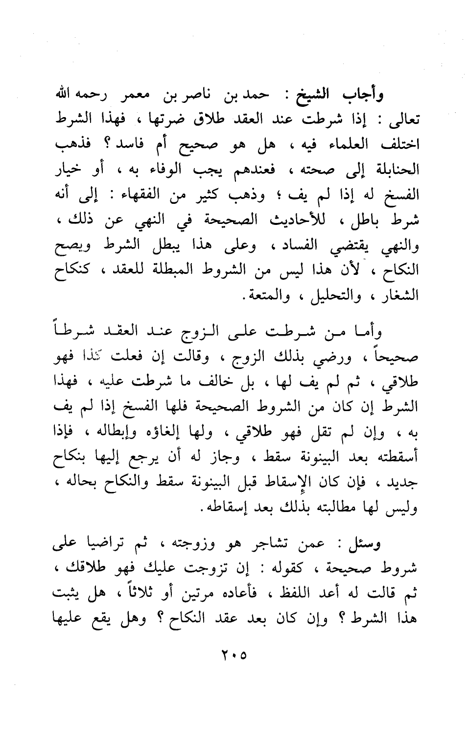 وأجاب الشيخ حمد بن ناصر بن معمر، رحمه الله تعالى: إذا شرطت عند العقد طلاق ضرتها، فهذا الشرط اختلف العلماء فيه: هل هو صحيح أم فاسد؟ فذهب الحنابلة إلى صحته، فعندهم يجب الوفاء به، أو خيار الفسخ له إذا لم يف; وذهب كثير من الفقهاء إلى أنه شرط باطل، للأحاديث الصحيحة في النهي عن ذلك، والنهي يقتضي الفساد. وعلى هذا، يبطل الشرط ويصح النكاح، لأن هذا ليس من الشروط المبطلة للعقد، كنكاح الشغار، والتحليل، والمتعة.