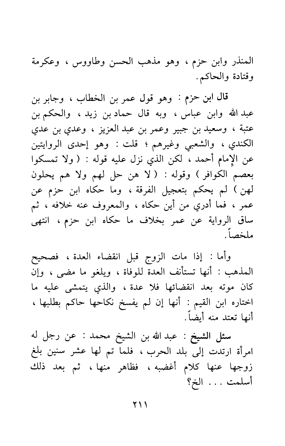 المنذر وابن حزم، وهو مذهب الحسن وطاووس، وعكرمة وقتادة والحاكم. قال ابن حزم: وهو قول عمر بن الخطاب، وجابر بن عبد الله وابن عباس، وبه قال حماد بن زيد، والحكم بن عتبة، وسعيد بن جبير وعمر بن عبد العزيز، وعدي بن عدي الكندي، والشعبي وغيرهم. قلت: وهو إحدى الروايتين عن الإمام أحمد، لكن الذي نزل عليه قوله: {وَلا تُمْسِكُوا بِعِصَمِ الْكَوَافِرِ} [سورة الممتحنة آية: 10] ، وقوله: {لا هُنَّ حِلٌّ لَهُمْ وَلا هُمْ يَحِلُّونَ لَهُنَّ} [سورة الممتحنة آية: 10] لم يحكم بتعجيل الفرقة، وما حكاه ابن حزم عن عمر، فما أدري من أين حكاه، والمعروف عنه خلافه. ثم ساق الرواية عن عمر بخلاف ما حكاه ابن حزم. انتهى ملخصاً.