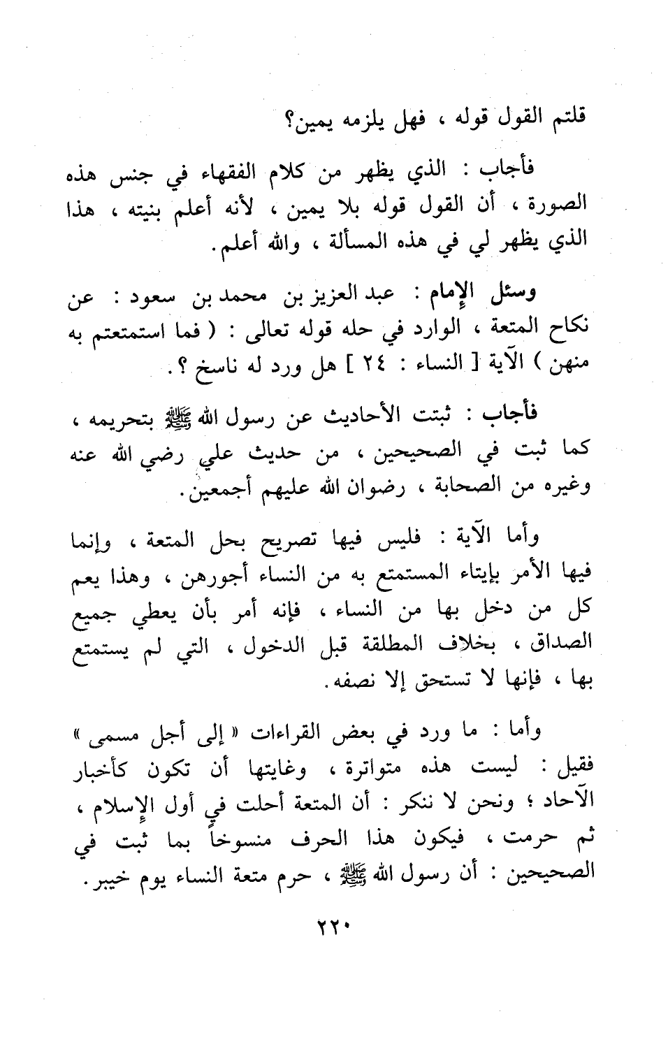 وسئل الإمام عبد العزيز بن محمد بن سعود: عن نكاح المتعة، الوارد في حله قوله تعالى: {فَمَا اسْتَمْتَعْتُمْ بِهِ مِنْهُنَّ} الآية [سورة النساء آية: 24] ، هل ورد له ناسخ؟