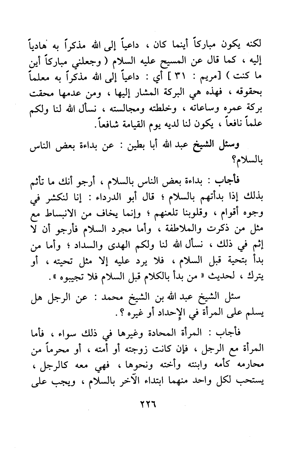 فأجاب: بداءة بعض الناس بالسلام، أرجو أنك ما تأثم بذلك إذا بدأتهم بالسلام; قال أبو الدرداء: "إنا لنكشر في وجوه أقوام، وقلوبنا تلعنهم"; وإنما يخاف من الانبساط مع مثل من ذكرت والملاطفة، وأما مجرد السلام فأرجو أن لا إثم في ذلك، نسأل الله لنا ولكم الهدى والسداد; وأما من بدأ بتحية قبل السلام، فلا يرد عليه إلا مثل تحيته، أو يترك، لحديث: " من بدأ بالكلام قبل السلام فلا تجيبوه ".