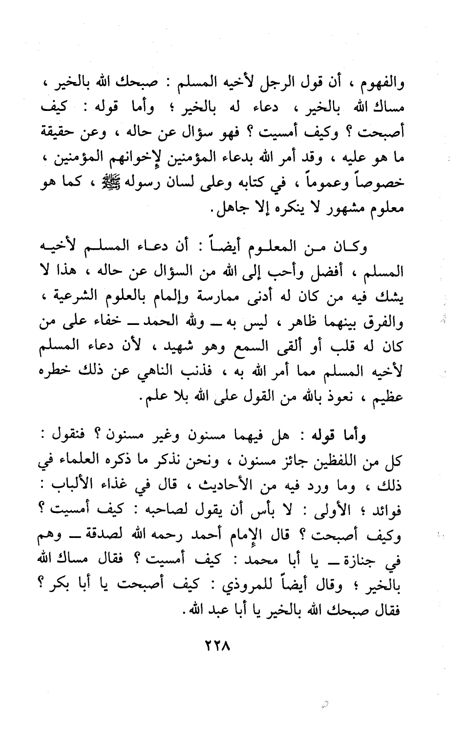 وأما قوله: هل فيهما مسنون وغير مسنون؟ فنقول: كل من اللفظين جائز مسنون، ونحن نذكر ما ذكره العلماء في ذلك، وما ورد فيه من الأحاديث: قال في غذاء الألباب: فوائد: الأولى: لا بأس أن يقول لصاحبه: كيف أمسيت؟ وكيف أصبحت؟ قال الإمام أحمد، رحمه الله، لصدقة - وهم في جنازة -: يا أبا محمد، كيف أمسيت؟ فقال: مساك الله بالخير; وقال أيضاً للمروذي: كيف أصبحت يا أبا بكر؟ فقال: صبحك الله بالخير يا أبا عبد الله.