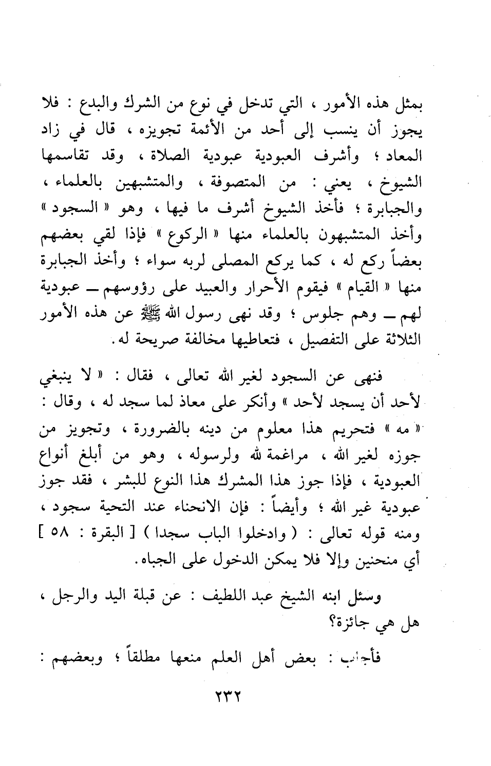 فنهى عن السجود لغير الله تعالى، فقال: "لا ينبغي لأحد أن يسجد لأحد "، وأنكر على معاذ لما سجد له، وقال: "مه! "؛ فتحريم هذا معلوم من دينه بالضرورة، وتجويز من جوزه لغير الله، مراغمة لله ولرسوله، وهو من أبلغ أنواع العبودية، فإذا جوز هذا المشرك هذا النوع للبشر، فقد جوز عبودية غير الله; وأيضاً، فإن الانحناء عند التحية سجود، ومنه قوله تعالى: {وَادْخُلُوا الْبَابَ سُجَّداً} [سورة البقرة آية: 58] أي: منحنين، وإلا فلا يمكن الدخول على الجباه.
