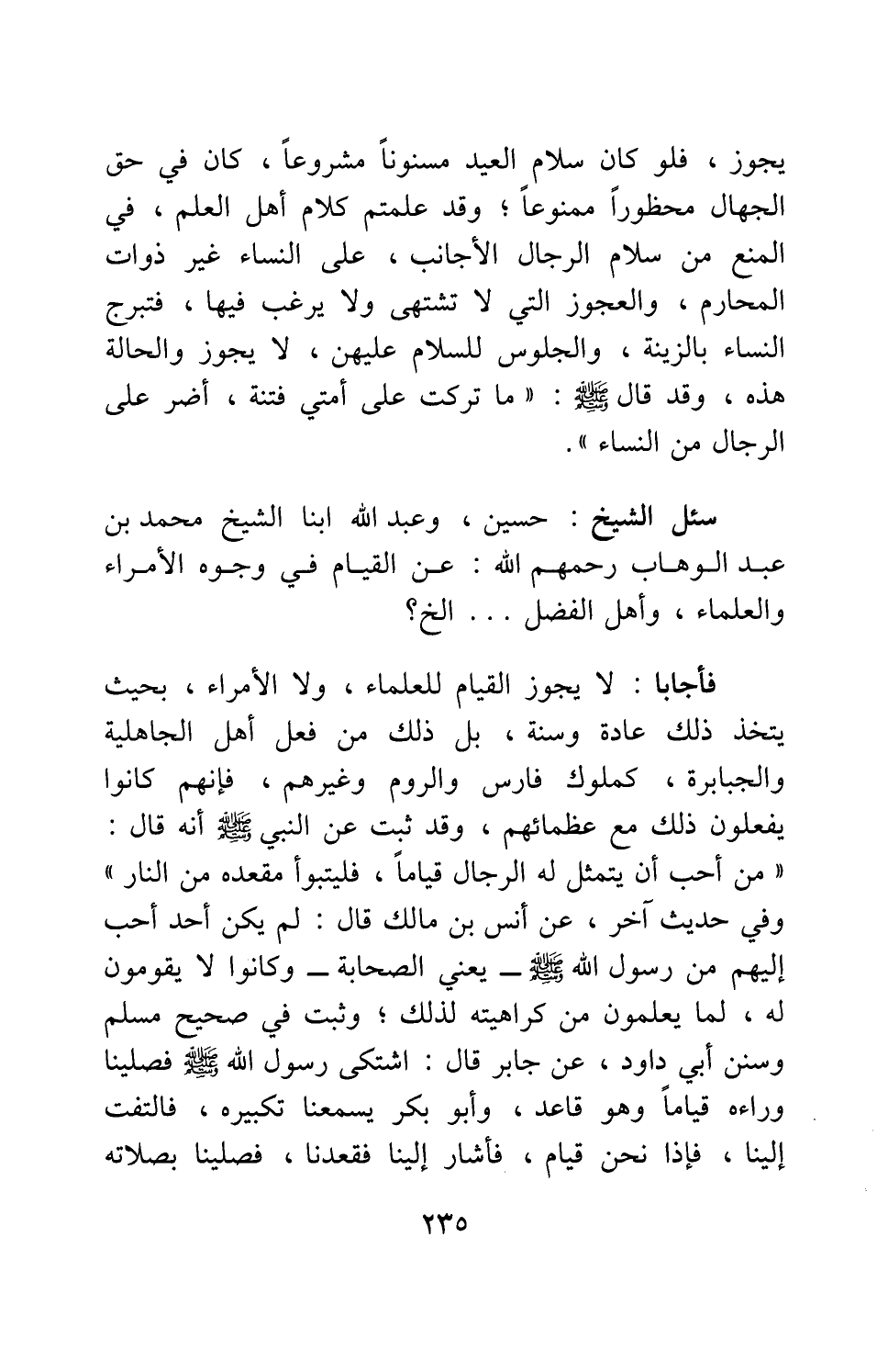 فأجابا: لا يجوز القيام للعلماء، ولا الأمراء، بحيث يتخذ ذلك عادة وسنة، بل ذلك من فعل أهل الجاهلية والجبابرة، كملوك فارس والروم وغيرهم، فإنهم كانوا يفعلون ذلك مع عظمائهم؛ وقد ثبت عن النبي صلى الله عليه وسلم أنه قال: " من أحب أن يتمثل له الرجال قياماً، فليتبوأ مقعده من النار " 2، وفي حديث آخر، عن أنس بن مالك قال: "لم يكن أحد أحب إليهم من رسول الله صلى الله عليه وسلم يعني الصحابة - وكانوا لا يقومون له، لما يعلمون من كراهيته لذلك "، وثبت في صحيح مسلم وسنن أبي داود، عن جابر قال:?"اشتكى رسول الله صلى الله عليه وسلم، فصلينا وراءه قياماً وهو قاعد، وأبو بكر يُسْمِعنا تكبيره، فالتفت إلينا، فإذا نحن قيام، فأشار إلينا فقعدنا، فصلينا بصلاته