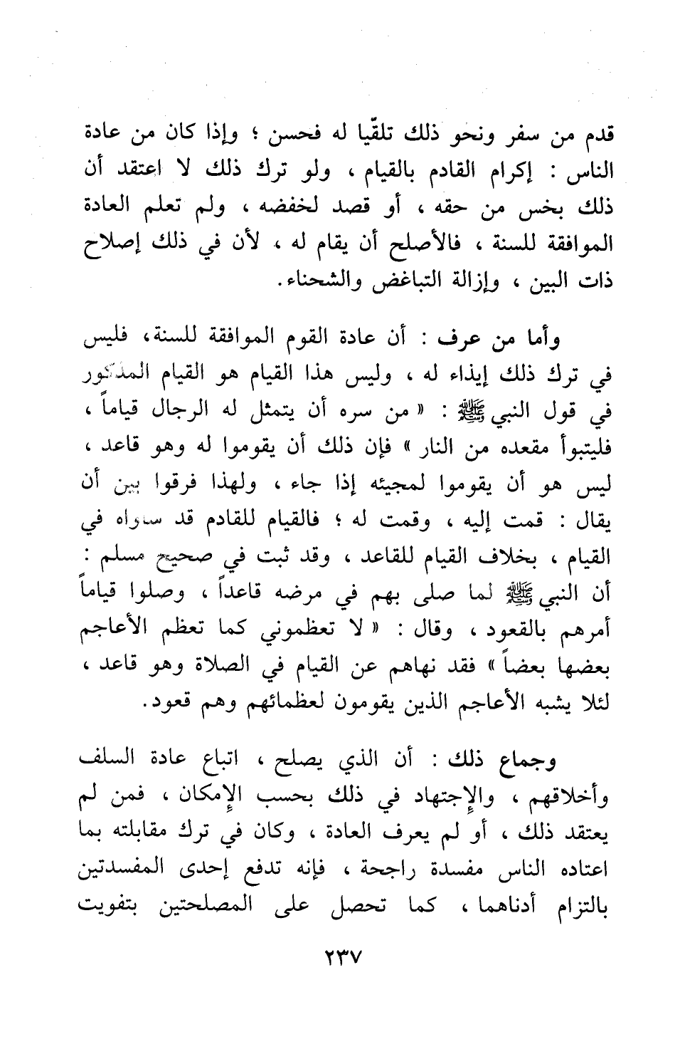 وأما من عرف أن عادة القوم الموافقة للسنة، فليس في ترك ذلك إيذاء له، وليس هذا القيام هو القيام المذكور في قول النبي صلى الله عليه وسلم: " من سره أن يتمثل له الرجال قياماً، فليتبوأ مقعده من النار " 1، فإن ذلك أن يقوموا له وهو قاعد، ليس هو أن يقوموا لمجيئه إذا جاء؛ ولهذا فرقوا بين أن يقال: قمت إليه، وقمت له; فالقيام للقادم قد سواه في القيام، بخلاف القيام للقاعد، وقد ثبت في صحيح مسلم: أن النبي صلى الله عليه وسلم لما صلى بهم في مرضه قاعداً وصلوا قياماً، أمرهم بالقعود، وقال: " لا تعظموني كما تعظم الأعاجم بعضها بعضاً" 2، فقد نهاهم من القيام في الصلاة وهو قاعد، لئلا يشبه الأعاجم الذين يقومون لعظمائهم وهم قعود.