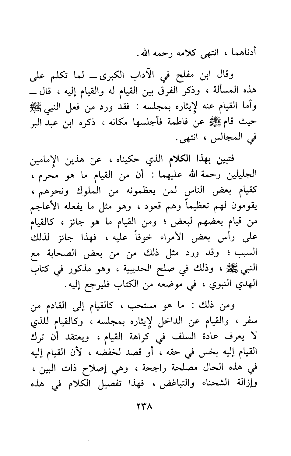 ومن ذلك: ما هو مستحب، كالقيام إلى القادم من سفر، والقيام عن الداخل لإيثاره بمجلسه، وكالقيام للذي لا يعرف عادة السلف في كراهة القيام، ويعتقد أن ترك القيام إليه بخس في حقه، أو قصد لخفضه، لأن القيام إليه في هذه الحال مصلحة راجحة، وهي إصلاح ذات البين، وإزالة الشحناء والتباغض؛ فهذا تفصيل الكلام في هذه