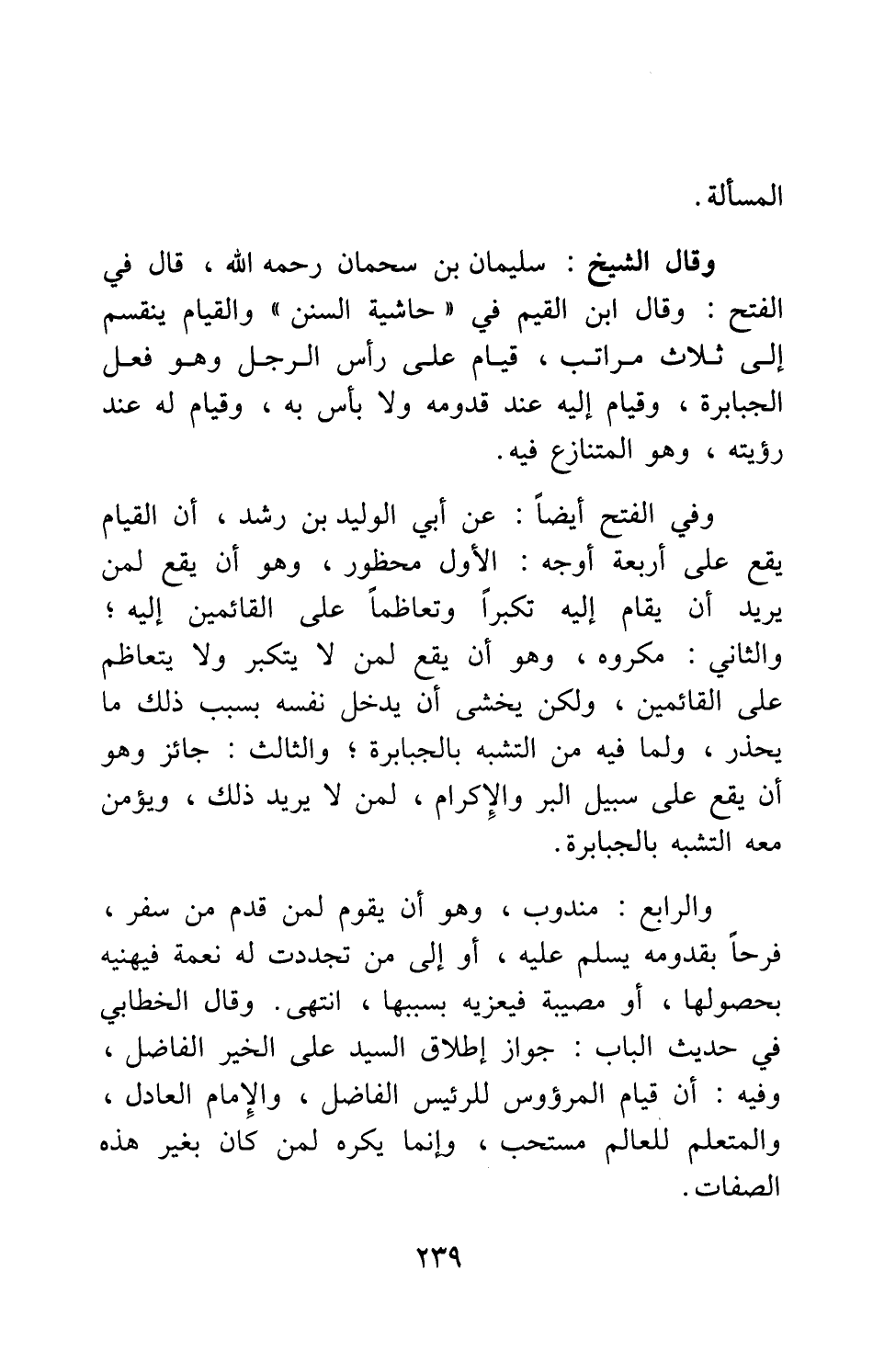 وقال الشيخ سليمان بن سحمان، رحمه الله: قال في الفتح: وقال ابن القيم في حاشية السنن: والقيام ينقسم إلى ثلاث مراتب: قيام على رأس الرجل وهو فعل الجبابرة، وقيام إليه عند قدومه ولا بأس به، وقيام له عند رؤيته وهو المتنازع فيه. وفي الفتح أيضاً: عن أبي الوليد بن رشد، أن القيام يقع على أربعة أوجه: