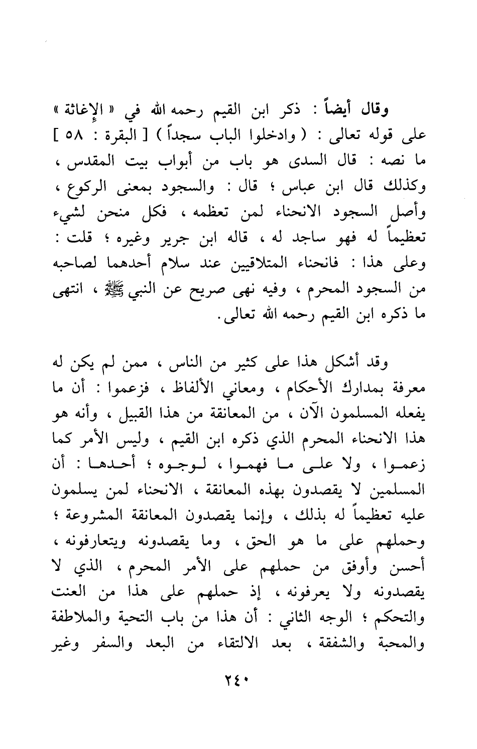 وقال أيضاً: ذكر ابن القيم، رحمه الله، في الإغاثة، على قوله تعالى: {وَادْخُلُوا الْبَابَ سُجَّداً} [سورة البقرة آية: 58] ما نصه: قال السدي: هو باب من أبواب بيت المقدس، وكذلك قال ابن عباس، قال: والسجود بمعنى الركوع، وأصل السجود الانحناء لمن تعظمه؛ فكل منحن لشيء تعظيماً له فهو ساجد له، قاله ابن جرير وغيره؛ قلت: وعلى هذا، فانحناء المتلاقيين عند سلام أحدهما لصاحبه، من السجود المحرم، وفيه نهى صريح عن النبي صلى الله عليه وسلم. انتهى ما ذكره ابن القيم، رحمه الله تعالى.