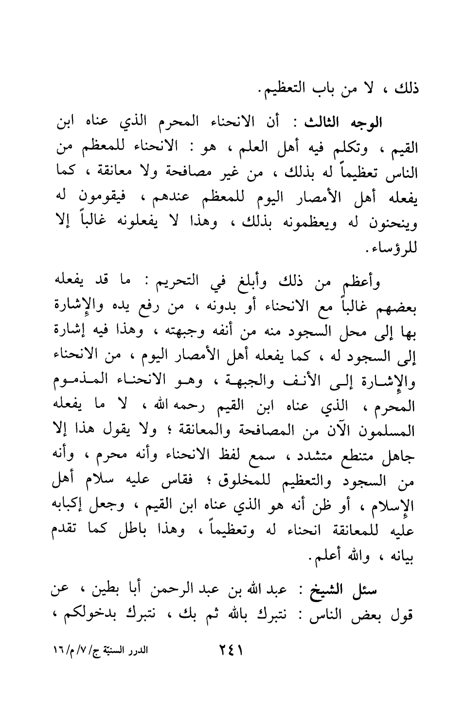 الوجه الثالث: أن الانحناء المحرم الذي عناه ابن القيم، وتكلم فيه أهل العلم، هو: الانحناء للمعظَّم من الناس تعظيماً له بذلك، من غير مصافحة ولا معانقة، كما يفعله أهل الأمصار اليوم للمعظم عندهم، فيقومون له وينحنون له ويعظمونه بذلك، وهذا لا يفعلونه غالبا إلا للرؤساء. وأعظم من ذلك وأبلغ في التحريم: ما قد يفعله بعضهم غالباً مع الانحناء أو بدونه، من رفع يده والإشارة بها إلى محل السجود منه من أنفه وجبهته، وهذا فيه إشارة إلى السجود له، كما يفعله أهل الأمصار اليوم، من الانحناء والإشارة إلى الأنف والجبهة، وهو الانحناء المذموم المحرم، الذي عناه ابن القيم، رحمه الله، لا ما يفعله المسلمون الآن من المصافحة والمعانقة; ولا يقول هذا إلا جاهل متنطع متشدد، سمع لفظ الانحناء وأنه محرم، وأنه من السجود والتعظيم للمخلوق، فقاس عليه سلام أهل الإسلام، أو ظن أنه هو الذي عناه ابن القيم، وجعل إكبابه عليه للمعانقة انحناء له وتعظيماً، وهذا باطل كما تقدم بيانه، والله أعلم.