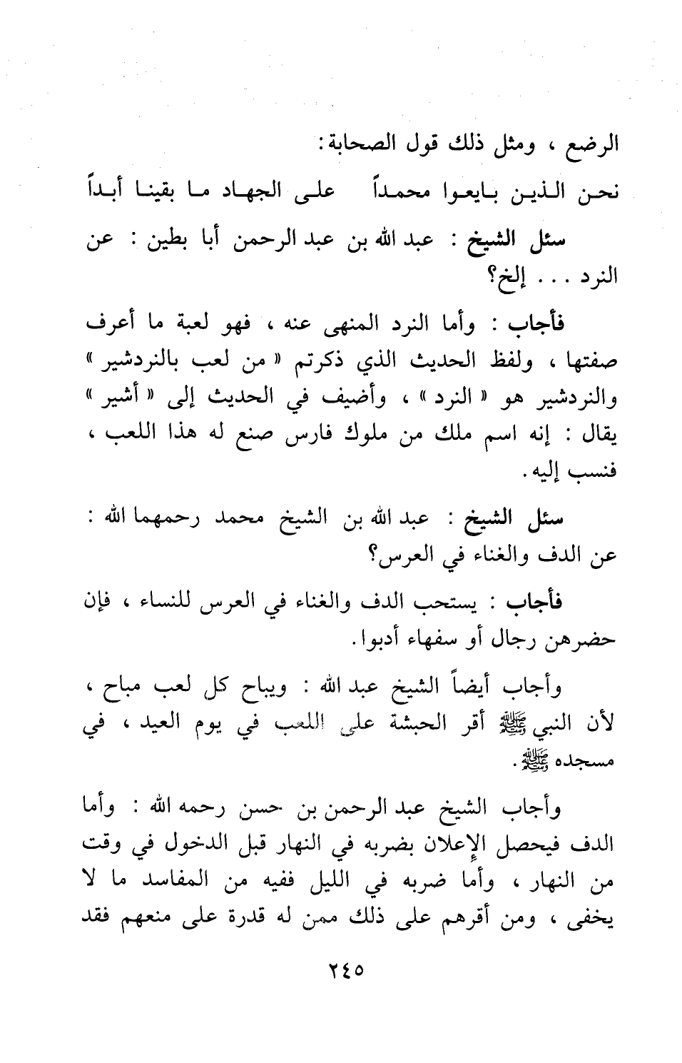 سئل الشيخ عبد الله بن الشيخ محمد، رحمهما الله: عن الدف والغناء في العرس؟