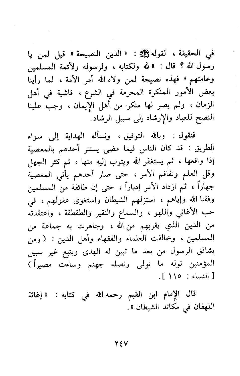 في الحقيقة، لقوله صلى الله عليه وسلم: " الدين النصيحة " 1، قيل: لمن يا رسول الله؟ قال: " لله ولكتابه، ولرسوله، ولأئمة المسلمين، وعامتهم " 2؛ فهذه نصيحة لمن ولاه الله أمر الأمة، لما رأينا بعض الأمور المنكرة المحرمة في الشرع، فاشية في أهل الزمان، ولم يصر لها مُنكِر من أهل الإيمان، وجب علينا النصح للعباد والإرشاد إلى سبيل الرشاد.