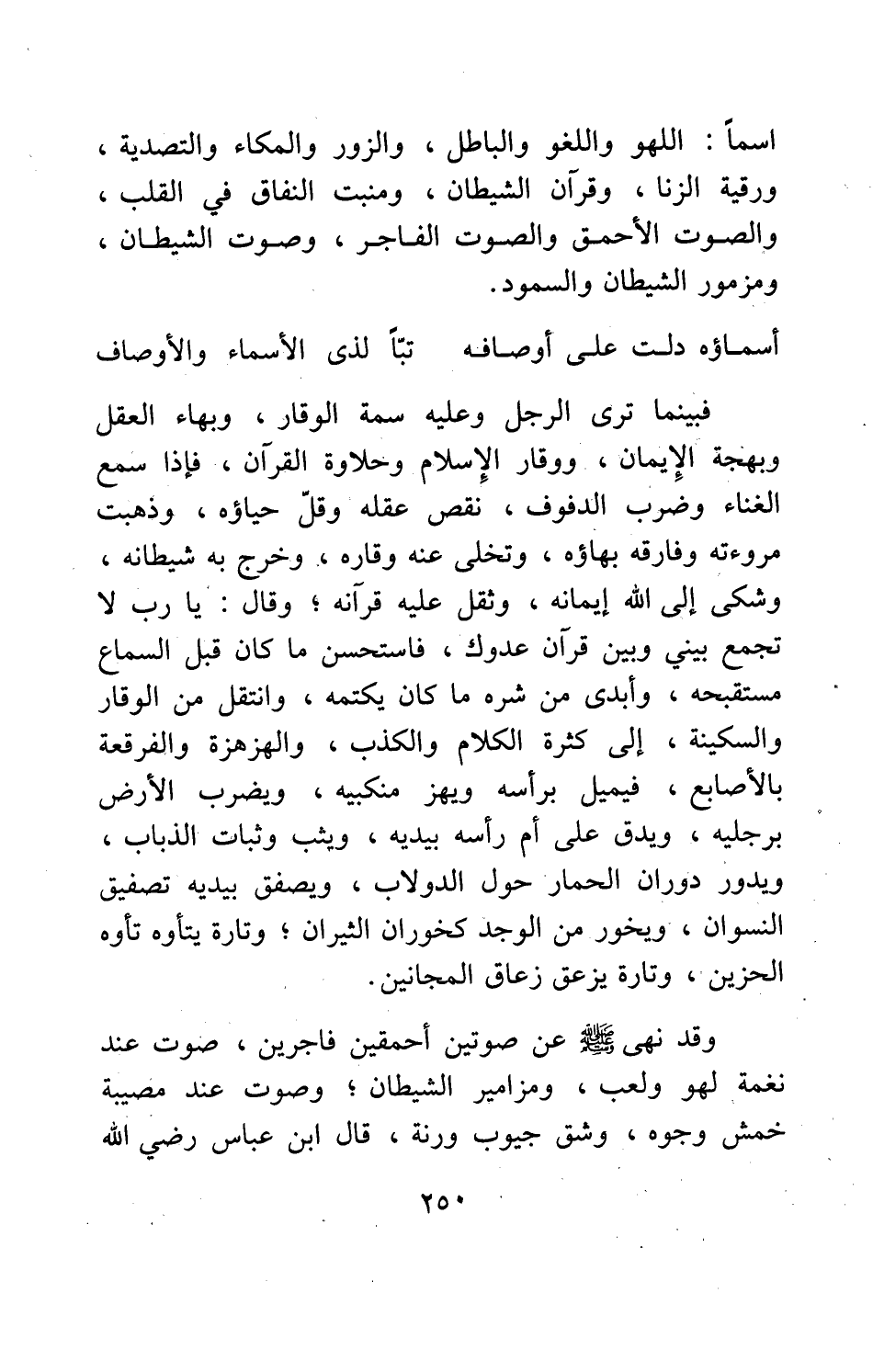 فبينما ترى الرجل وعليه سمة الوقار، وبهاء العقل وبهجة الإيمان، ووقار الإسلام وحلاوة القرآن، فإذا سمع الغناء وضرب الدفوف، نقص عقله وقل حياؤه، وذهبت مروءته وفارقه بهاؤه، وتخلى عنه وقاره، وخرج به شيطانه، وشكا إلى الله إيمانه، وثقل عليه قرآنه، وقال: يا رب لا تجمع بيني وبين قرآن عدوك؛ فاستحسن ما كان قبل السماع مُستقبِحه، وأبدى من شره ما كان يكتمه، وانتقل من الوقار والسكينة إلى كثرة الكلام والكذب، والهزهزة والفرقعة بالأصابع؛ فيميل برأسه ويهز منكبيه، ويضرب الأرض برجليه، ويدق على أم رأسه بيديه، ويثب وَثَبات الذباب، ويدور دوران الحمار حول الدولاب، ويصفق بيديه تصفيق النسوان، ويخور من الوجد كخوران الثيران; وتارة يتأوه تأوه الحزين، وتارة يزعق زعاق المجانين.