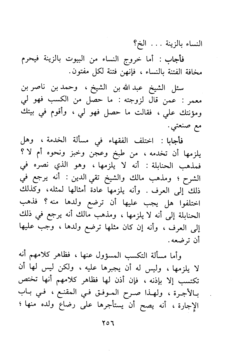 فأجابا: اختلف الفقهاء في مسألة الخدمة، وهل يلزمها أن تخدمه، من طبخ وعجن وخبز ونحوه، أم لا؟ فمذهب الحنابلة: أنه لا يلزمها، وهو الذي نصره في الشرح. ومذهب مالك والشيخ تقي الدين: أنه يرجع في ذلك إلى العرف، وأنه يلزمها عادة أمثالها لمثله. وكذلك اختلفوا هل يجب عليها أن ترضع ولدها منه؟ فذهب الحنابلة إلى أنه لا يلزمها، ومذهب مالك أنه يرجع في ذلك إلى العرف، وأنه إن كان مثلها ترضع ولدها، وجب عليها أن ترضعه.
