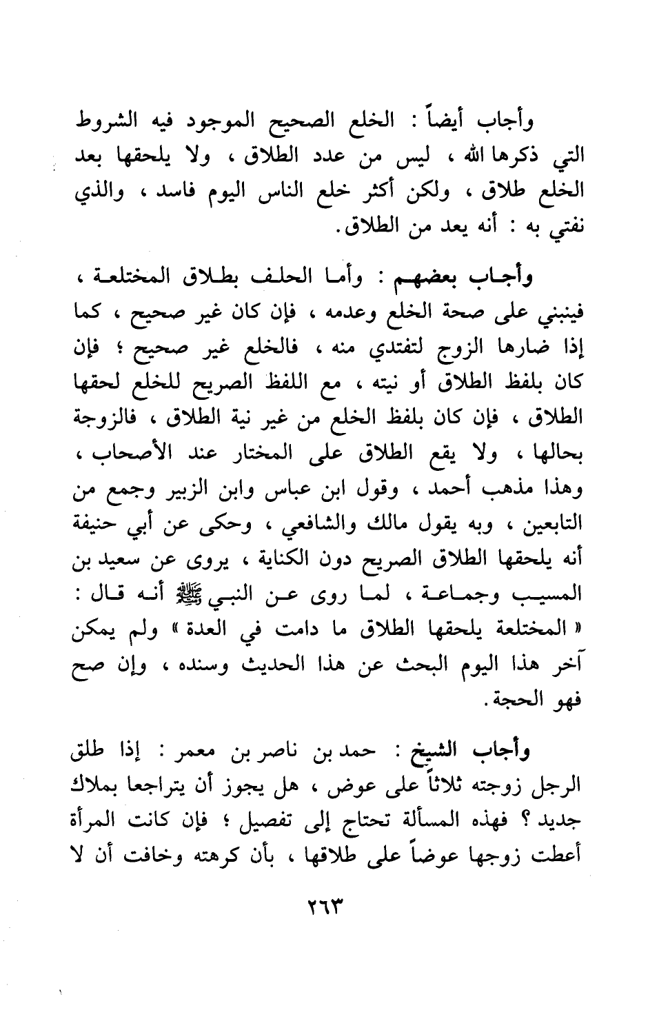 وأجاب الشيخ حمد بن ناصر بن معمر: إذا طلق الرجل زوجته ثلاثاً على عوض، هل يجوز أن يتراجعا بملاك جديد؟ فهذه المسألة تحتاج إلى تفصيل: فإن كانت المرأة أعطت زوجها عوضاً على طلاقها، بأن كرهته وخافت أن لا