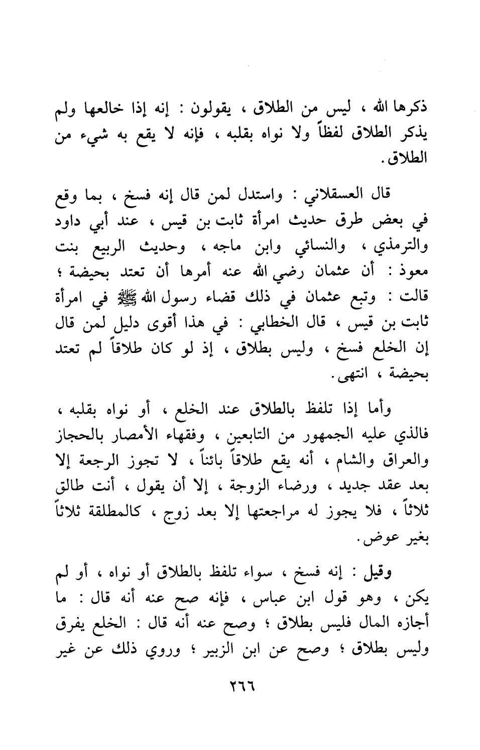 وقيل: إنه فسخ، سواء تلفظ بالطلاق أو نواه، أو لم يكن؛ وهو قول ابن عباس، فإنه صح عنه أنه قال: "ما أجازه المال فليس بطلاق"، وصح عنه أنه قال: "الخلع يفرق وليس بطلاق"، وصح عن ابن الزبير; وروي ذلك عن غير