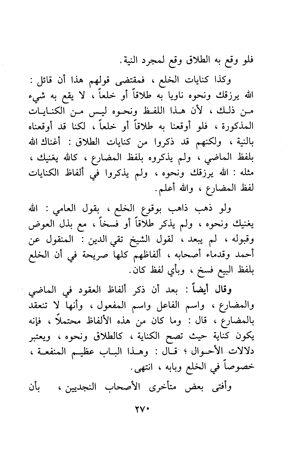 وكذا كنايات الخلع، فمقتضى قولهم هذا أن قائل: الله يرزقك ونحوه، ناوياً به طلاقاً أو خلعاً، لا يقع به شيء من ذلك، لأن هذا اللفظ ونحوه ليس من الكنايات المذكورة، فلو أوقعنا به طلاقاً أو خلعاً، لكنا قد أوقعناه بالنية؛ ولكنهم قد ذكروا من كنايات الطلاق: أغناك الله، بلفظ الماضي، ولم يذكروه بلفظ المضارع، كالله يغنيك، مثله: الله يرزقك ونحوه، ولم يذكروا في ألفاظ الكنايات لفظ المضارع، والله أعلم.