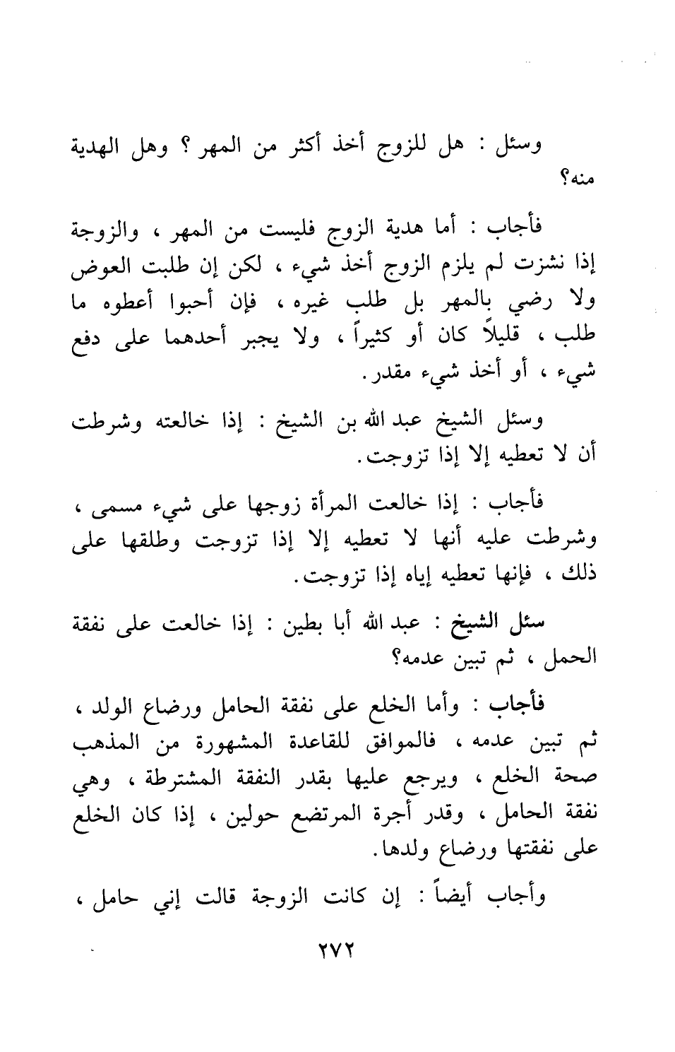 فأجاب: أما هدية الزوج فليست من المهر، والزوجة إذا نشزت لم يلزم الزوج أخذ شيء، لكن إن طلبت العوض ولا رضي بالمهر بل طلب غيره، فإن أحبوا أعطوه ما طلب، قليلاً كان أو كثيراً، ولا يجبر أحدهما على دفع شيء أو أخذ شيء مقدر.