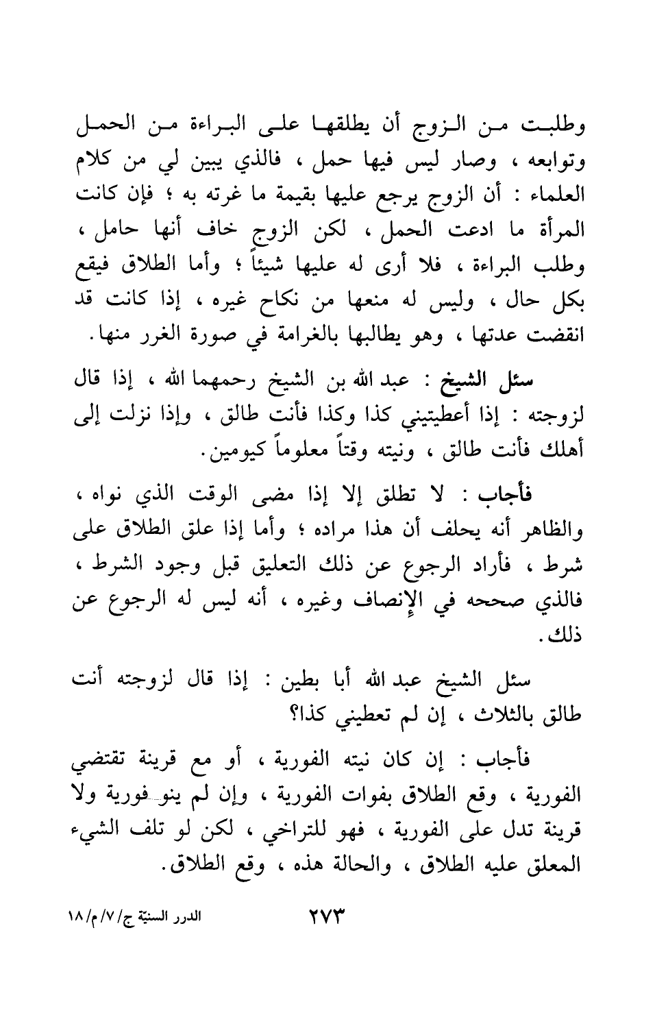 سئل الشيخ عبد الله أبا بطين: إذا قال لزوجته: أنت طالق بالثلاث، إن لم تعطيني كذا؟