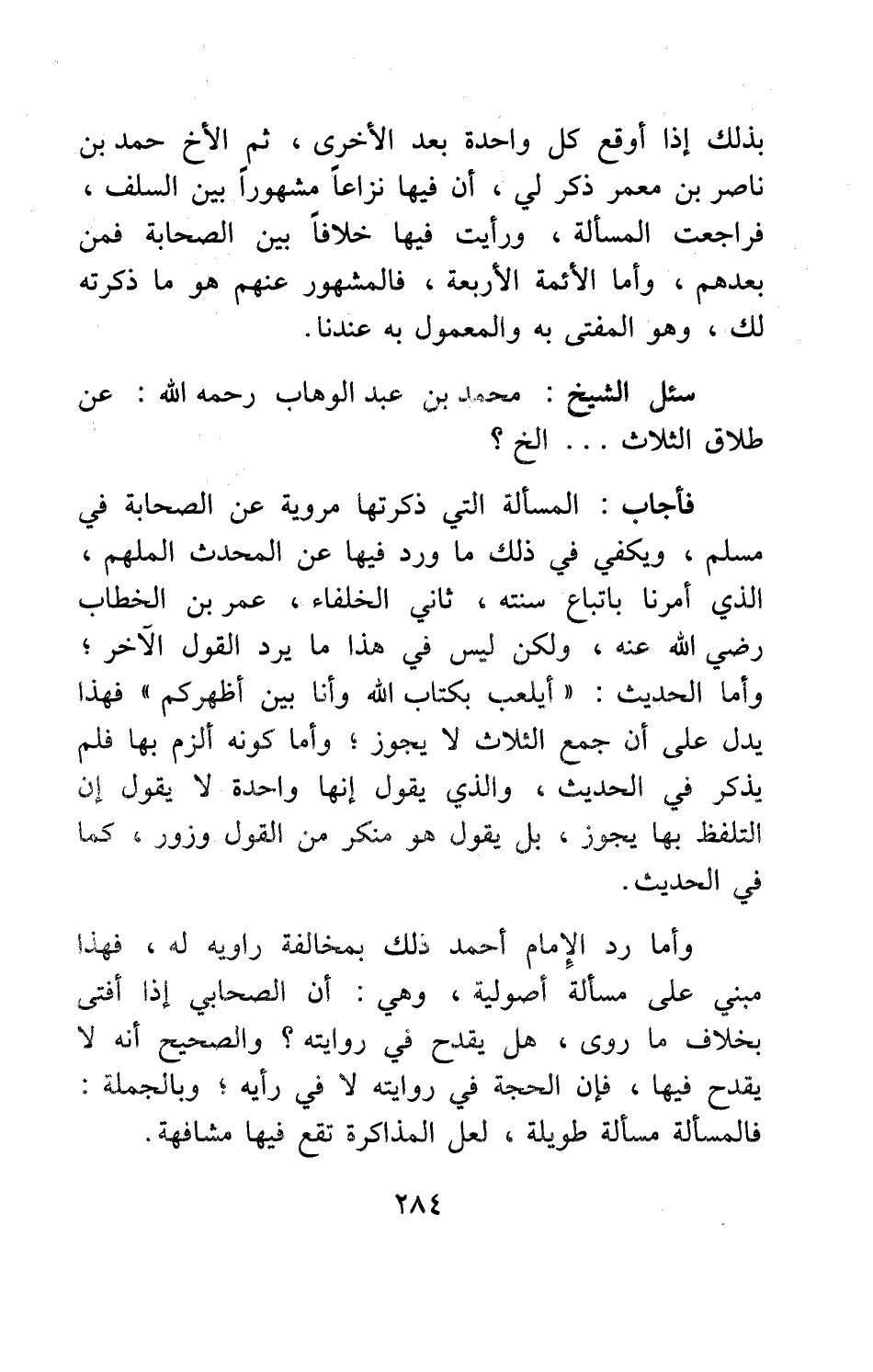 فأجاب: المسألة التي ذكرتها مروية عن الصحابة في مسلم، ويكفي في ذلك ما ورد فيها عن المحدَّث الملهَم، الذي أُمِرْنا باتباع سنته، ثاني الخلفاء، عمر بن الخطاب، رضي الله عنه، ولكن ليس في هذا ما يرد القول الآخر. وأما الحديث: " أيلعب بكتاب الله وأنا بين أظهركم؟ " 1، فهذا يدل على أن جمع الثلاث لا يجوز; وأما كونه ألزم بها فلم يذكر في الحديث؛ والذي يقول: إنها واحدة، لا يقول: إن التلفظ بها يجوز، بل يقول: هو منكر من القول وزور، كما في الحديث.