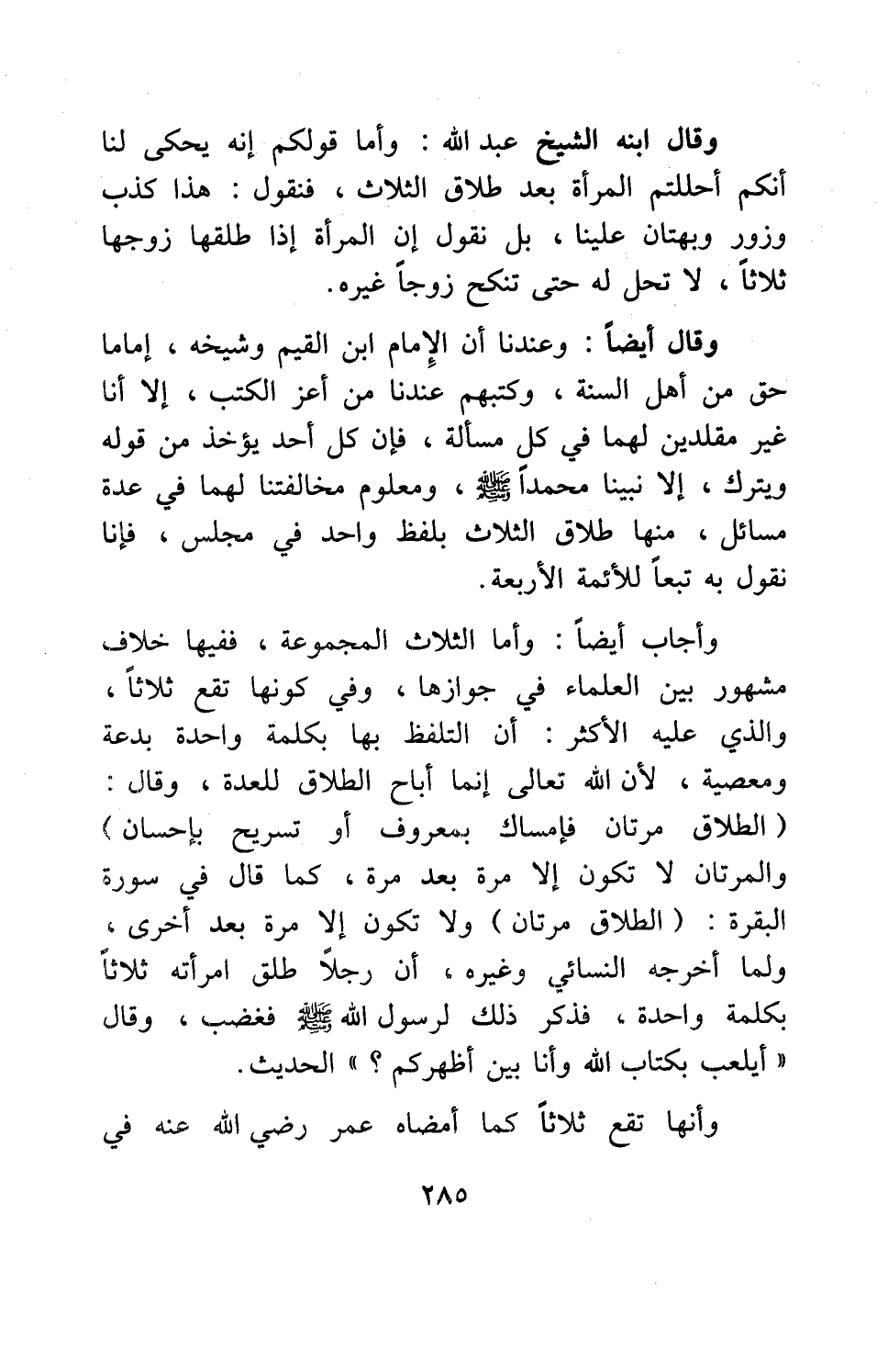 وقال ابنه: الشيخ عبد الله: وأما قولكم إنه يحكى لنا أنكم أحللتم المرأة بعد طلاق الثلاث، فنقول: هذا كذب وزور وبهتان علينا، بل نقول إن المرأة إذا طلقها زوجها ثلاثاً، لا تحل له حتى تنكح زوجاً غيره.